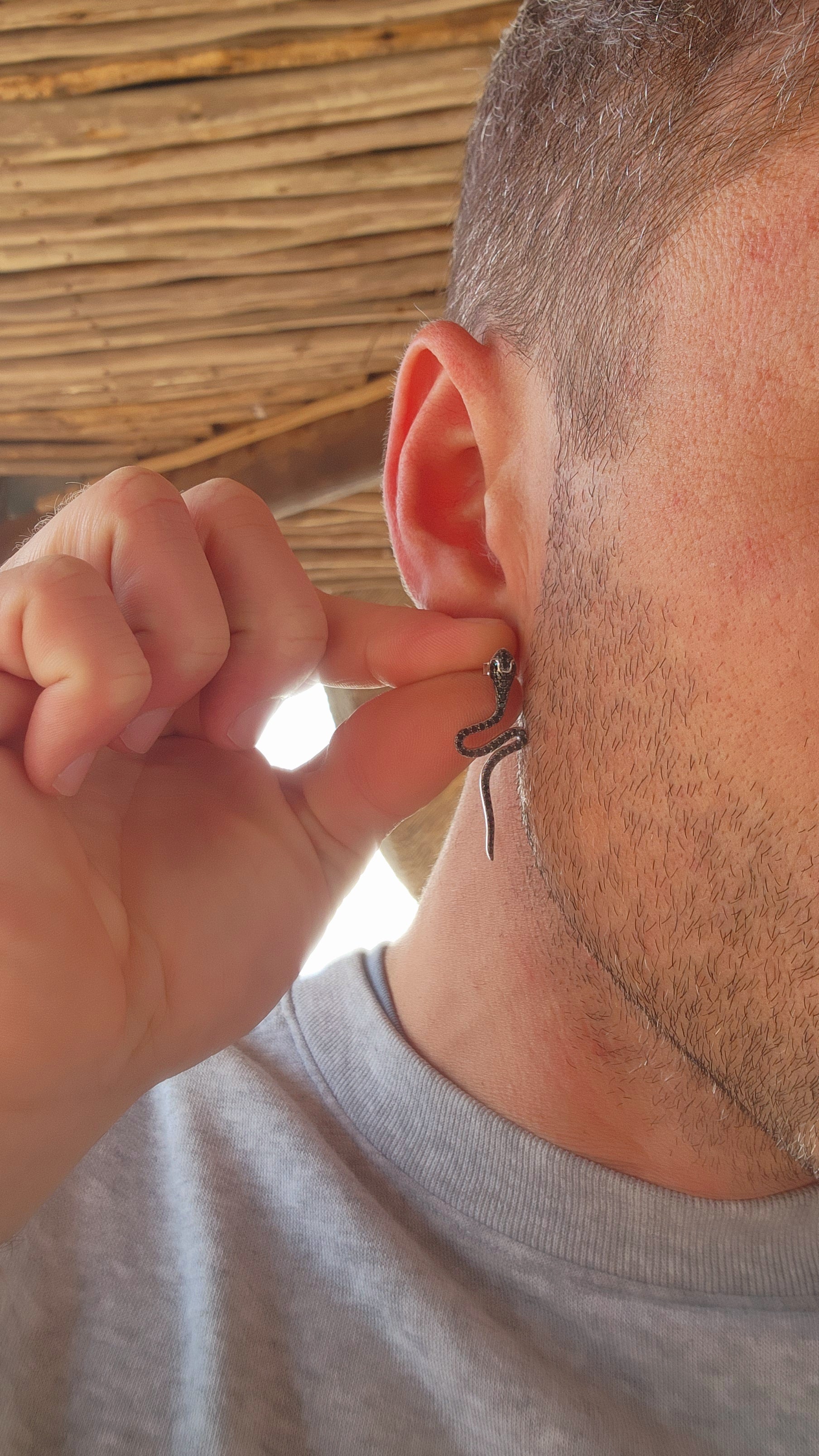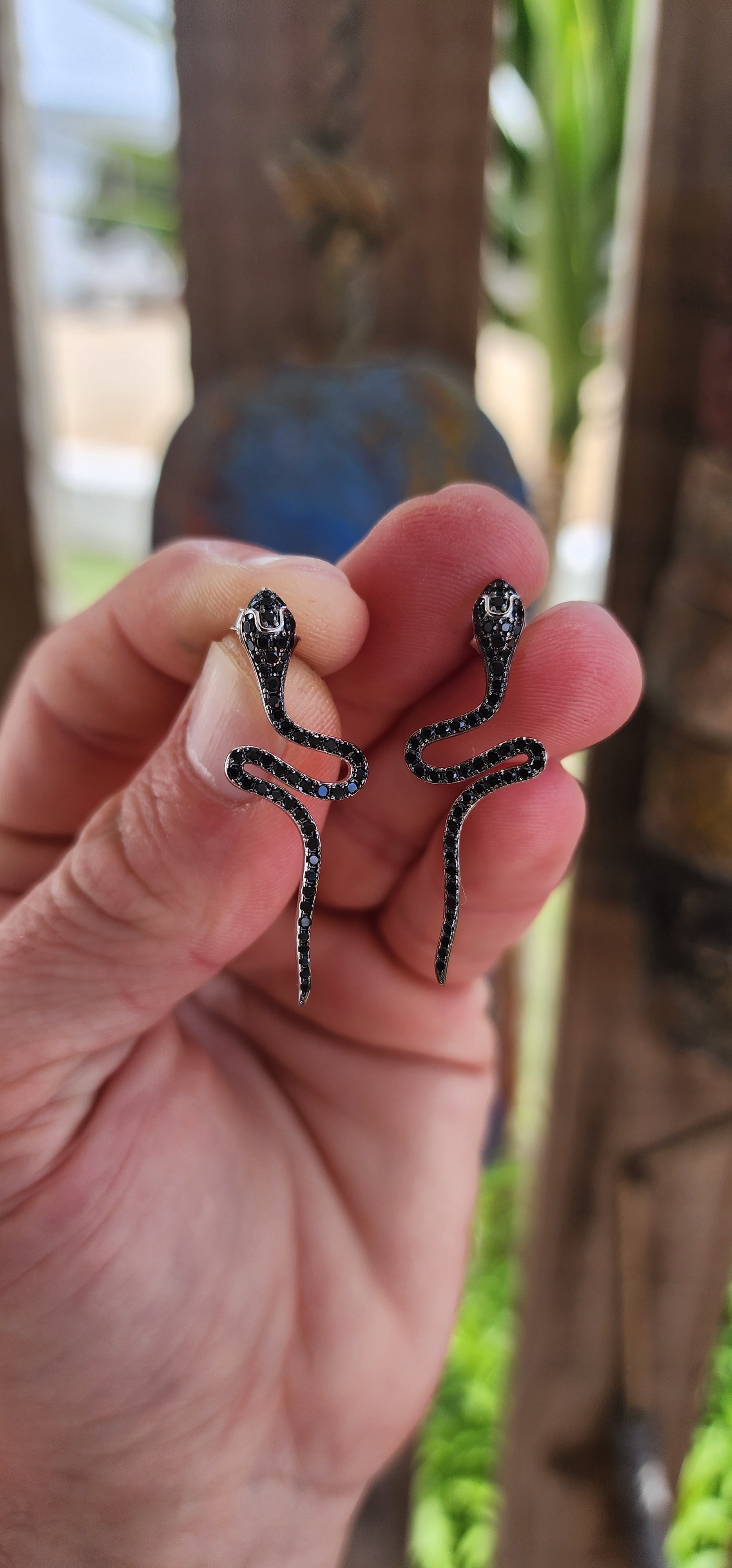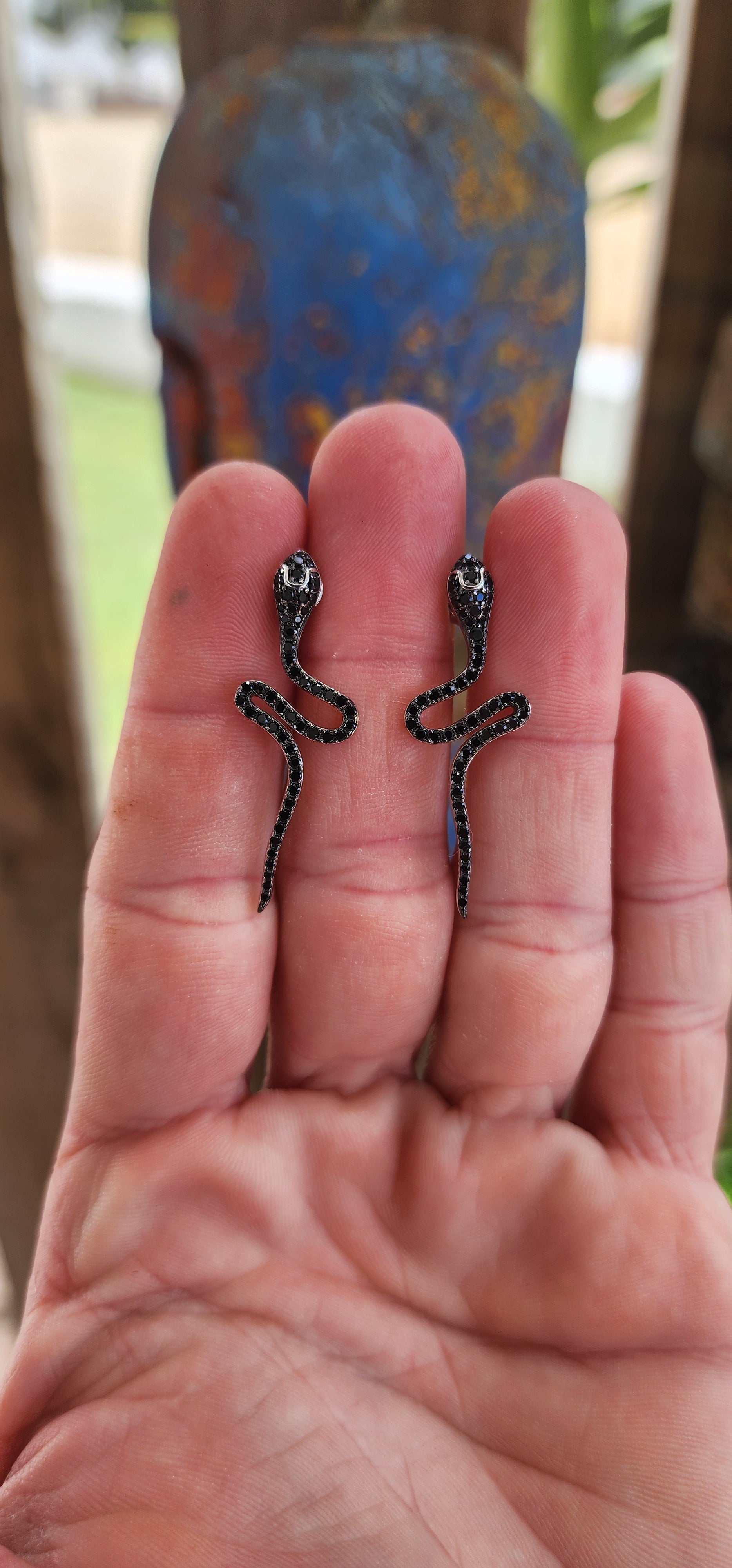 Their coiled bodies gleam with an armor of black spinel gemstones, catching the light with every tilt of your head, while their piercing eyes seem to hold an ancient, mischievous wisdom. They slither elegantly down your lobes, making a bold statement that says, "Yes, I’m fierce and fabulous." With a secure push-in design, these serpents are ready to charm the world, one stare at a time.