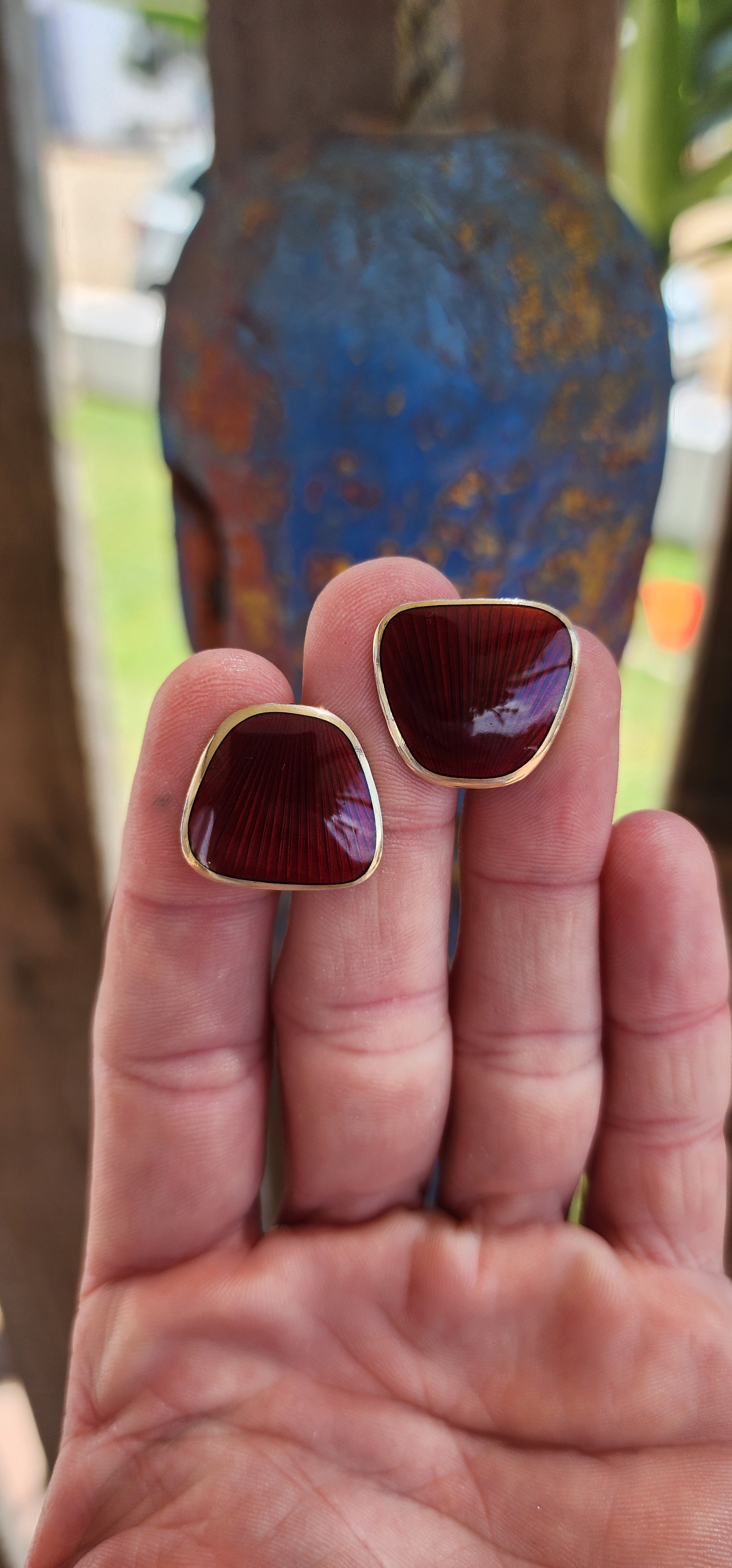 The asymmetric, pebble-like shape of the enamel panel—a hallmark of modernist design—gives these cufflinks a fluid and organic elegance.