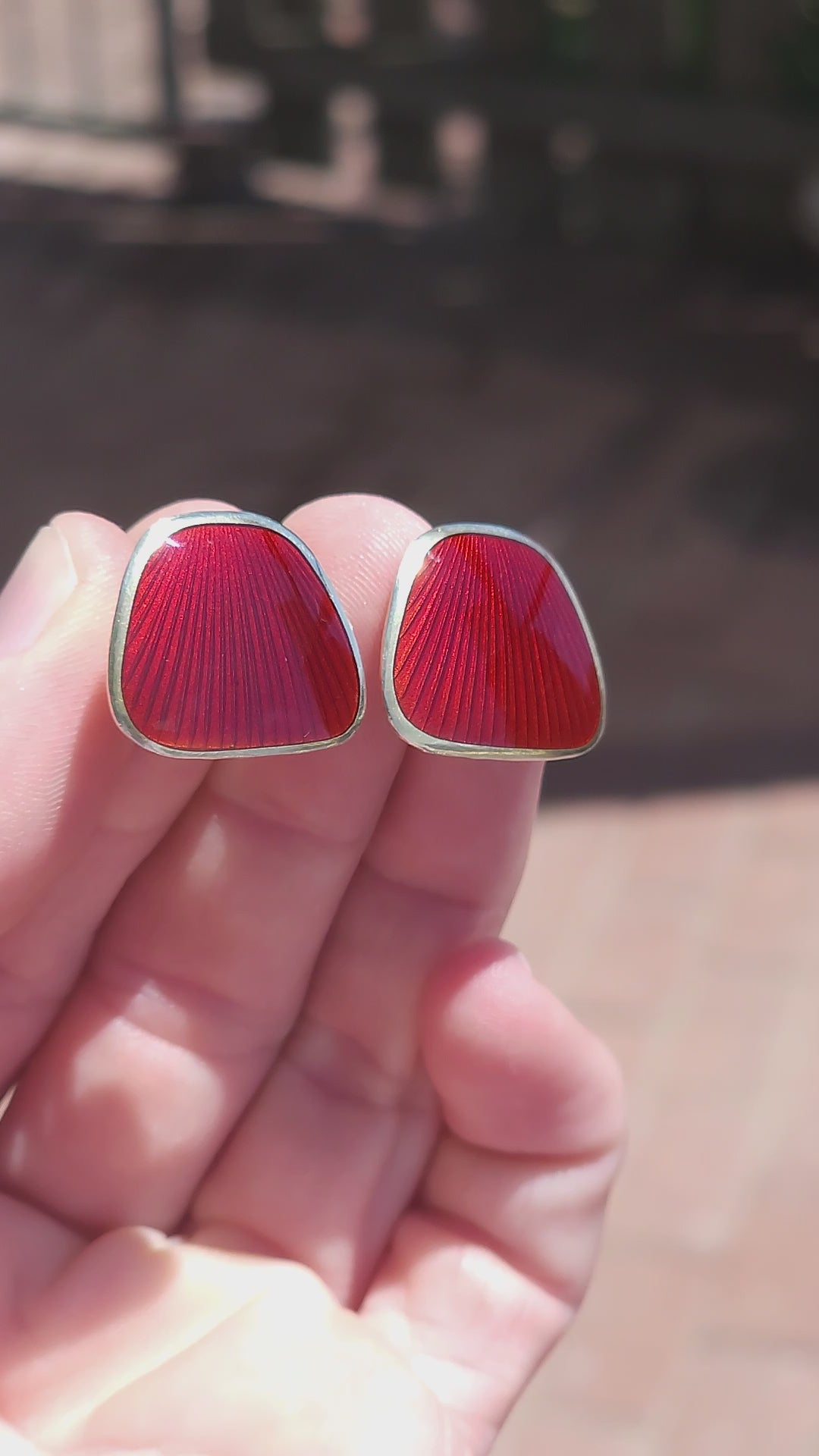The design showcases Jensen's mastery of guilloché enamel: a radiant ruby-red, translucent enamel layered over a meticulously engraved geometric pattern, creating an almost hypnotic, rippled effect as it catches the light. Each cufflink is framed in a gilded sterling silver setting (marked 925S), blending warmth and refinement.