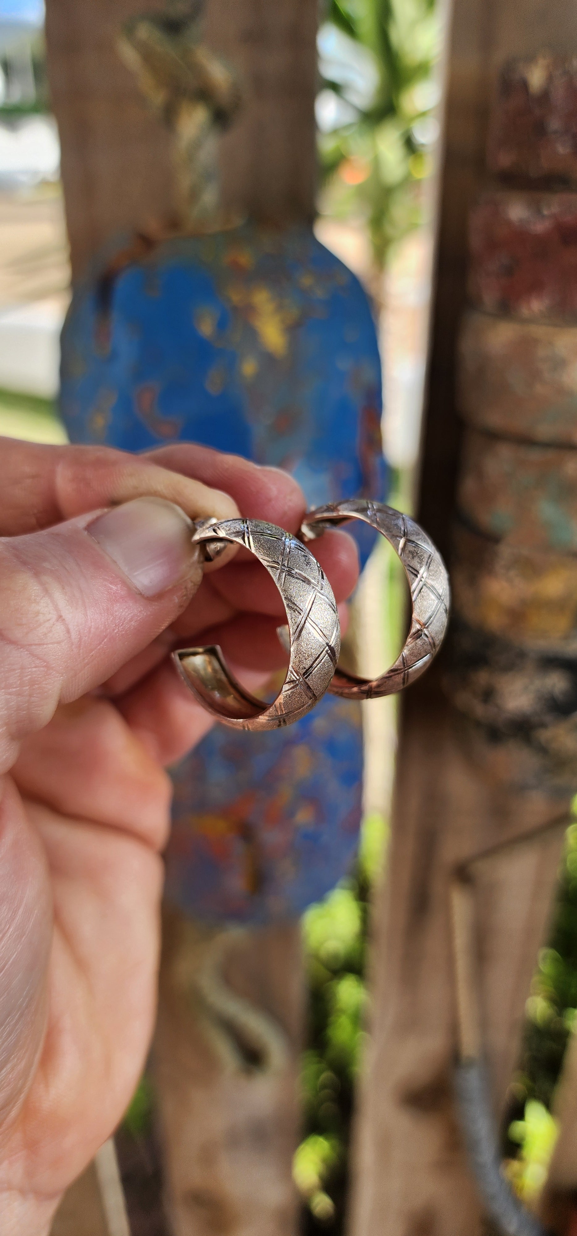 What sets these beauties apart is the intricately etched crosshatch pattern—a series of finely engraved crisscrossing lines that form a quilted diamond motif across the entire front surface. This detailing adds depth, dimension, and a subtle shimmer as light dances along the brushed and textured finish. The etched grooves are both decorative and tactile, offering a rustic-meets-refined aesthetic.