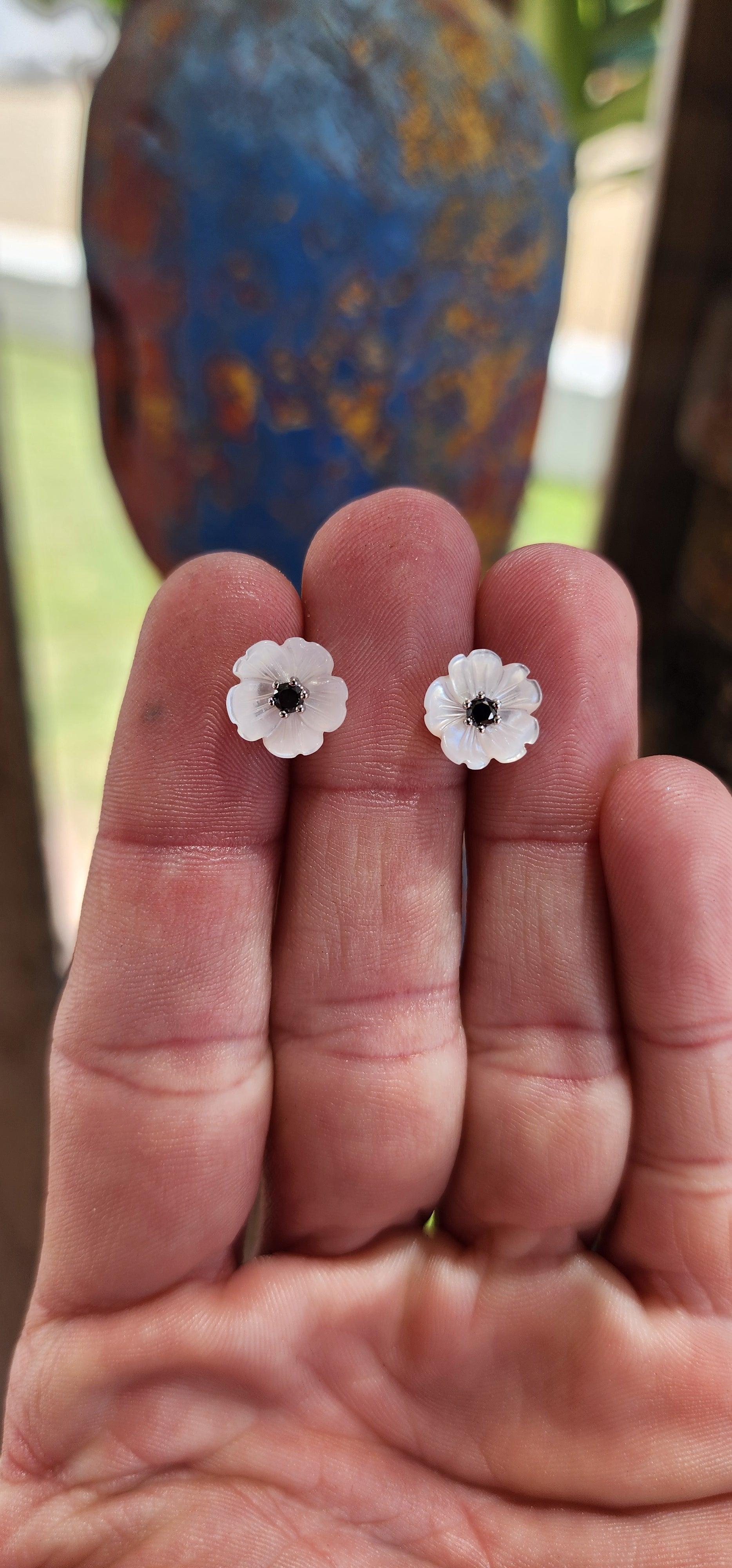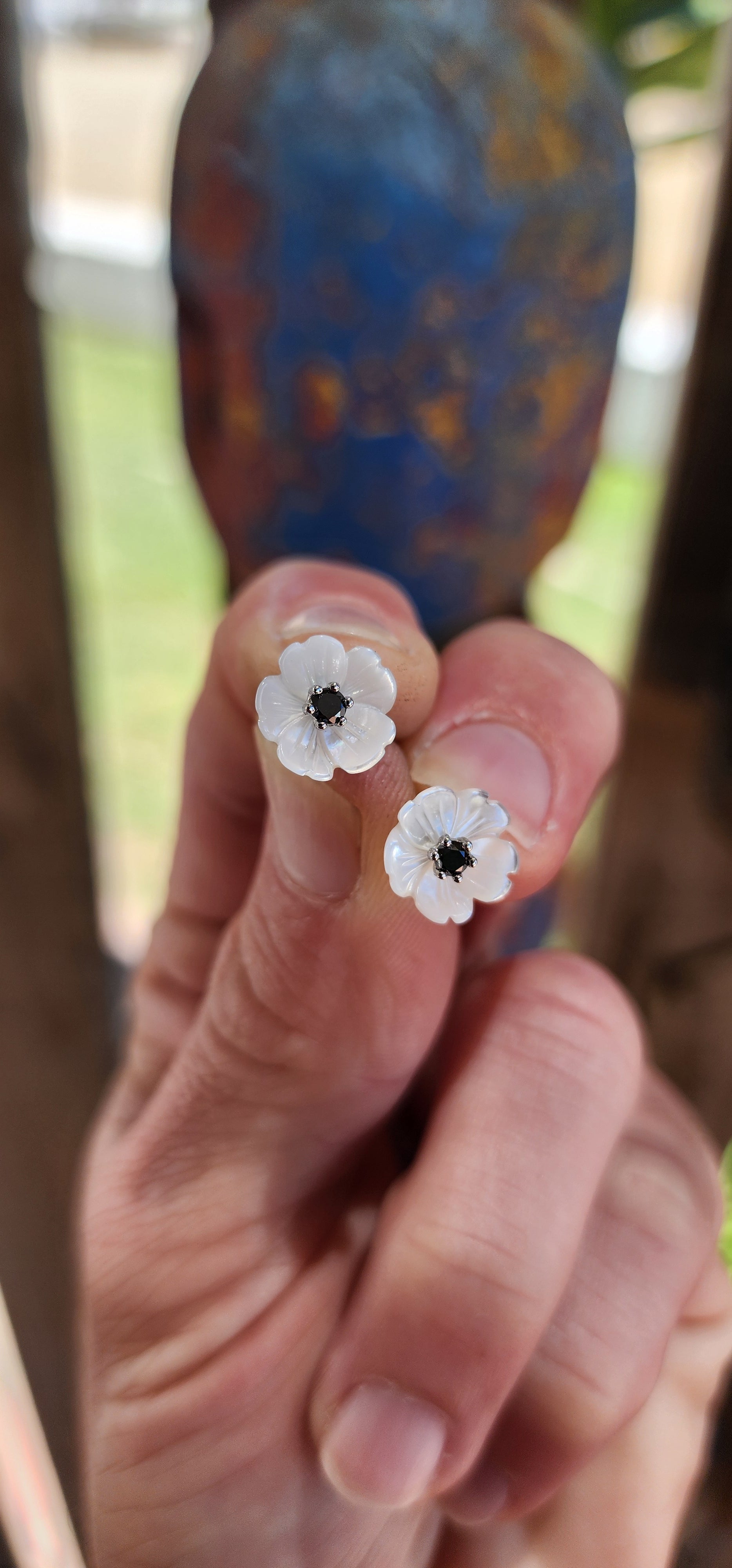 These stud earrings are like delicate little blooms frozen in time, a perfect mix of nature’s grace and a dash of glamour. Each one is a miniature garden on your ears—tiny Burnet Roses carved from shimmering Mother of Pearl with Black Diamonds.