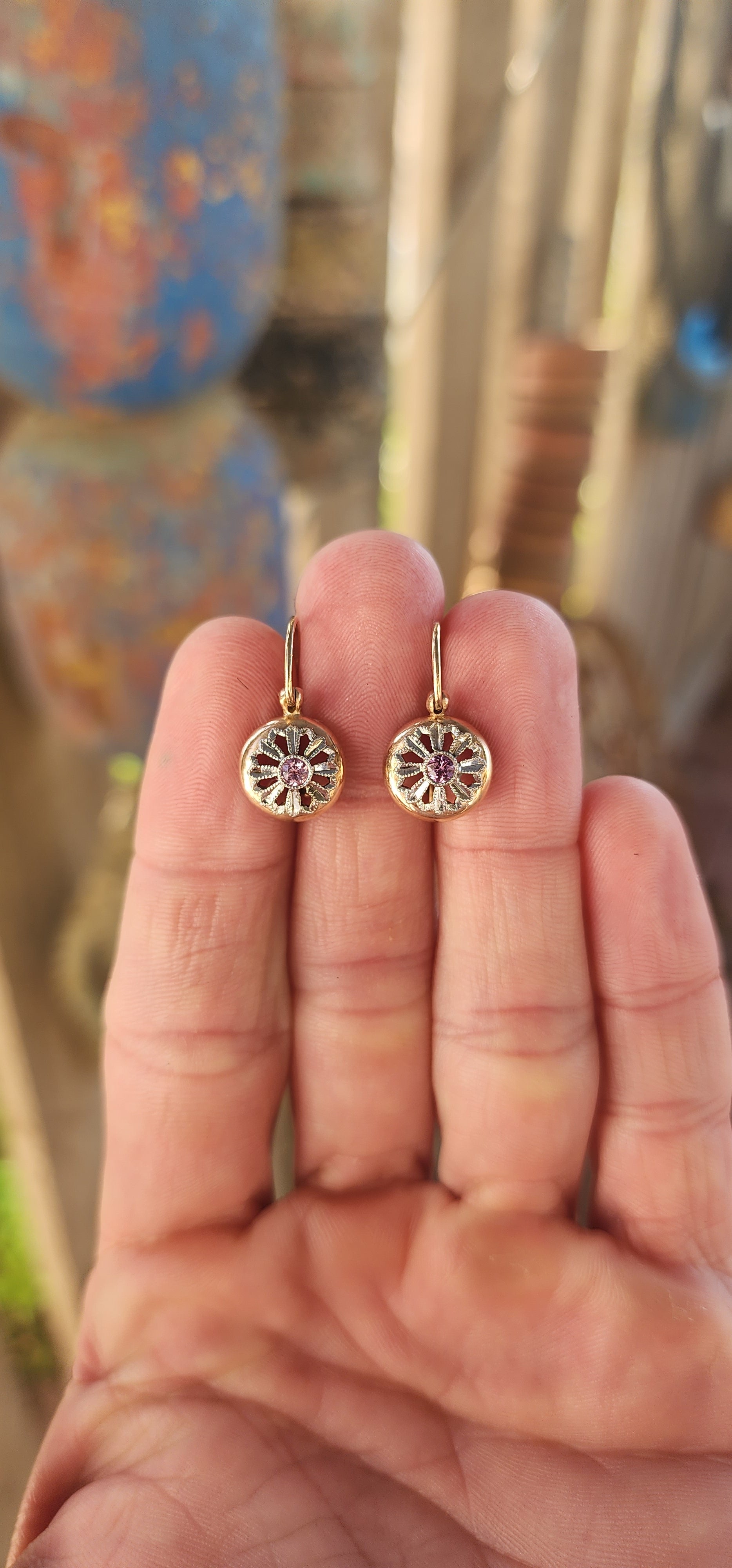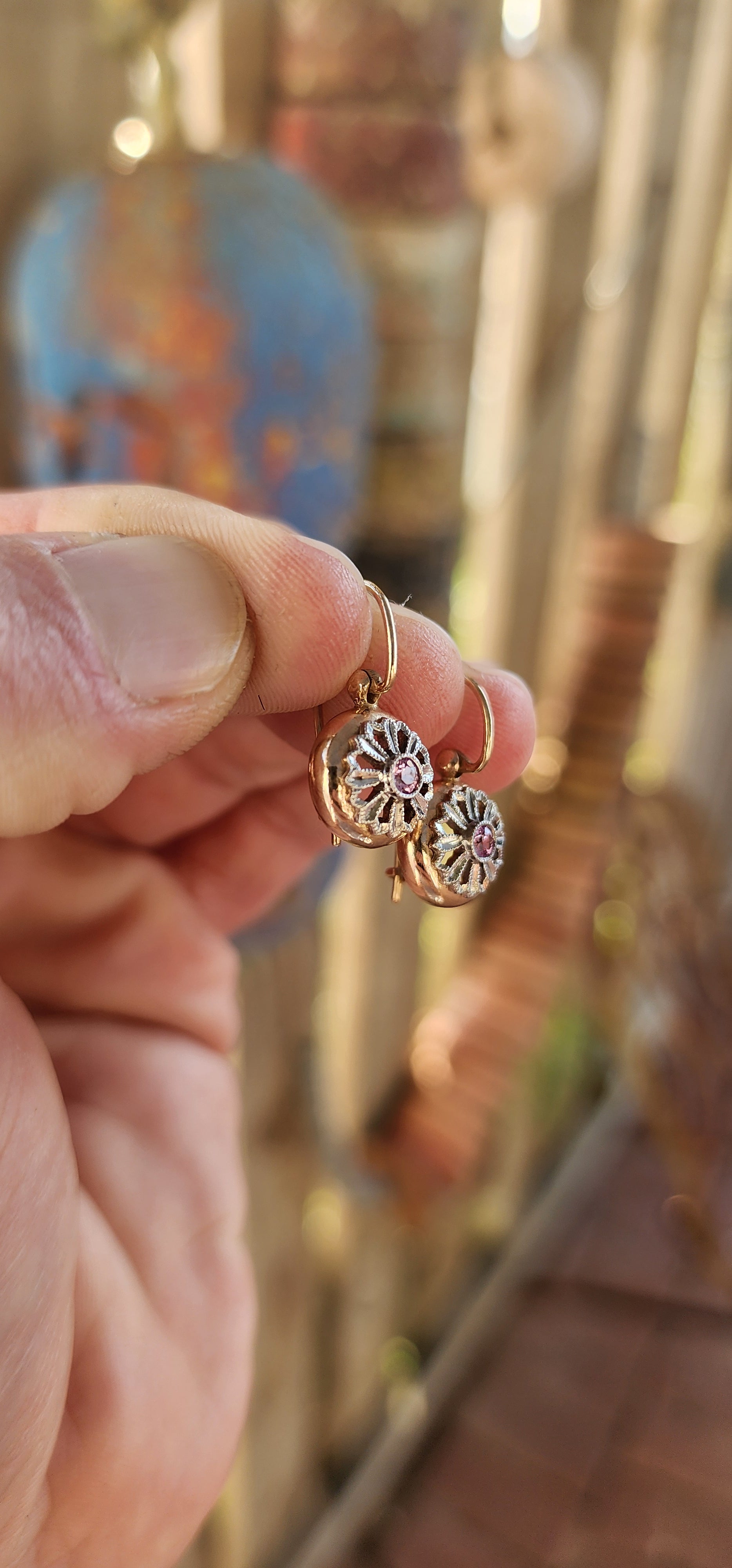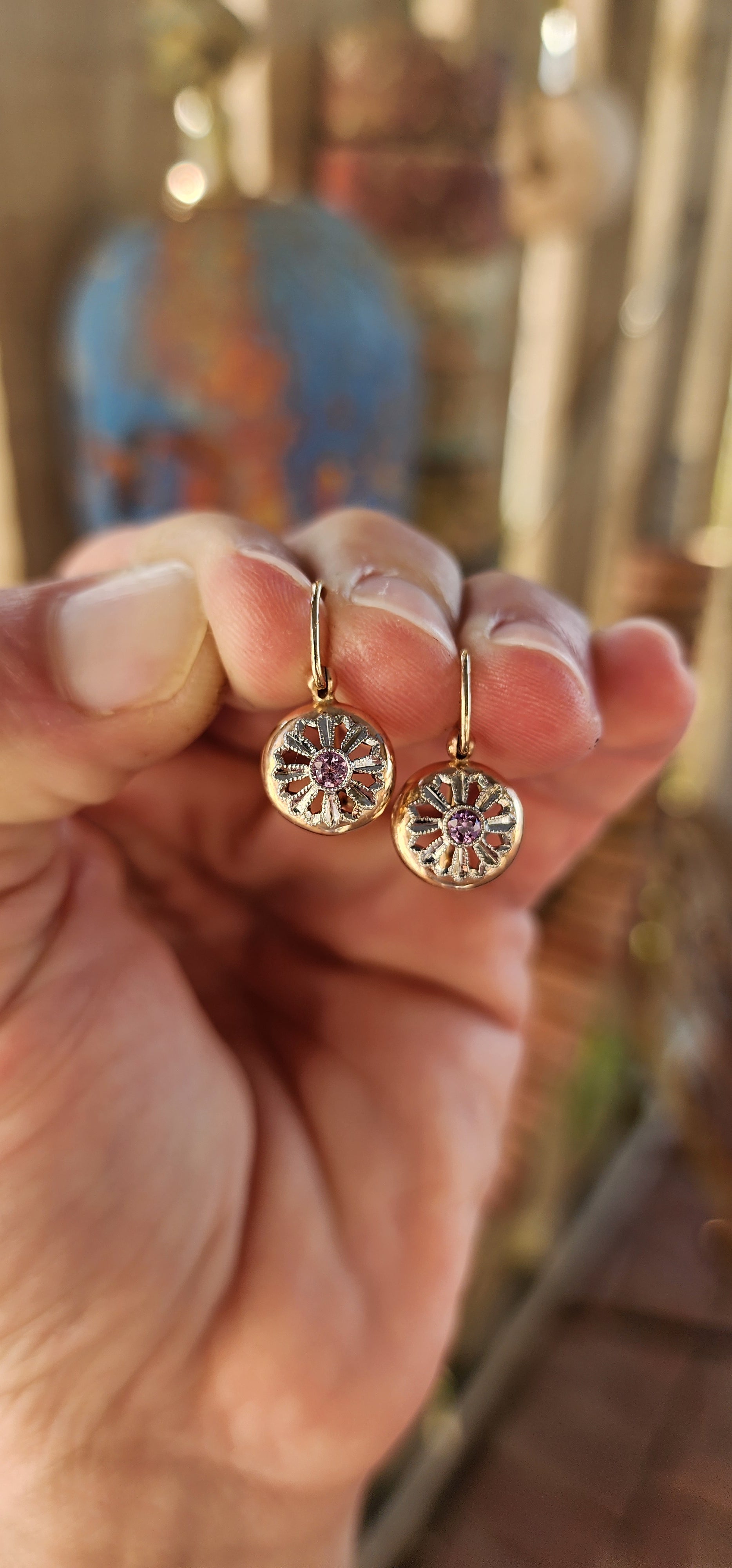 Crafted in rich 9ct rose gold, each earring is a miniature domed masterpiece—circular in shape and softly puffed, like golden buttons plucked from a royal corset. At the center of each dome bursts an ornate, openwork sunburst flower motif in 9ct white gold, exquisitely pierced and raised, catching the light with every gentle sway. This little floral firework is the star of the show, drawing your eyes to the heart: a dazzling round-cut pink tourmaline, bezel-set with delicate precision. The subtle sparkle of the tourmaline adds a whisper of whimsy and a lovely splash of feminine grace.