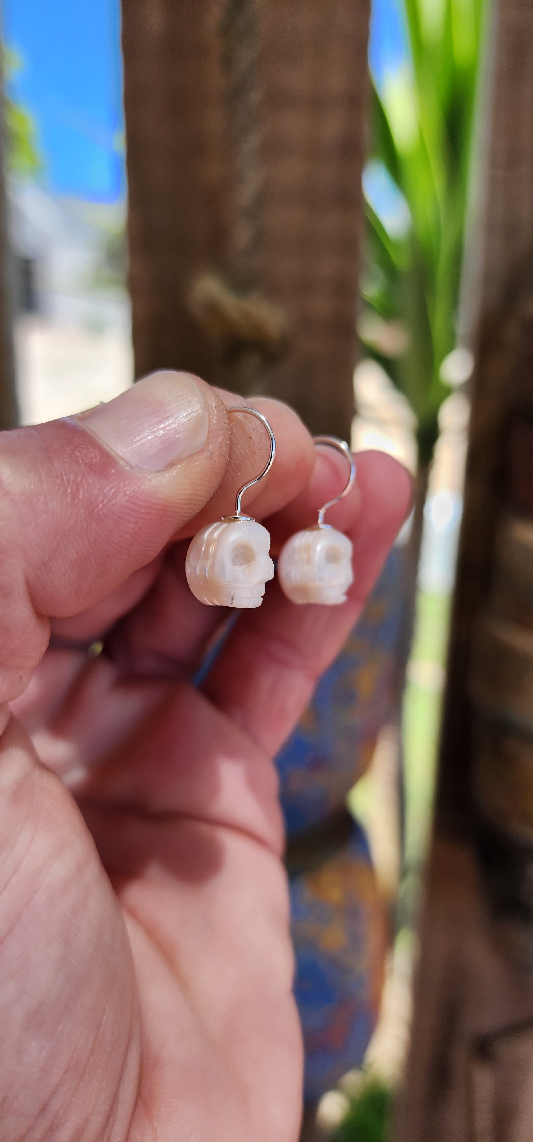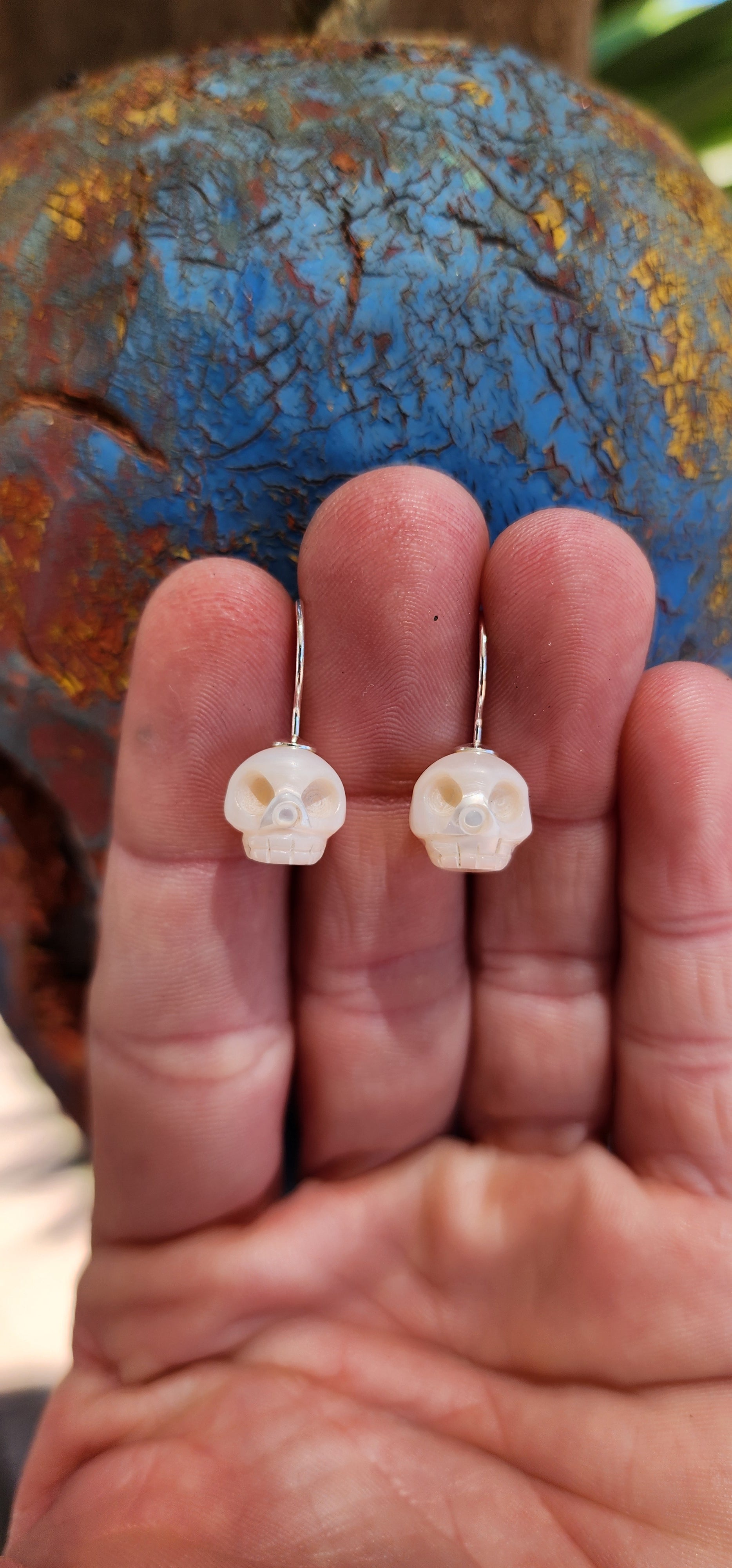 The hand carved skulls are suspended on Sterling Silver shepherd’s hooks.