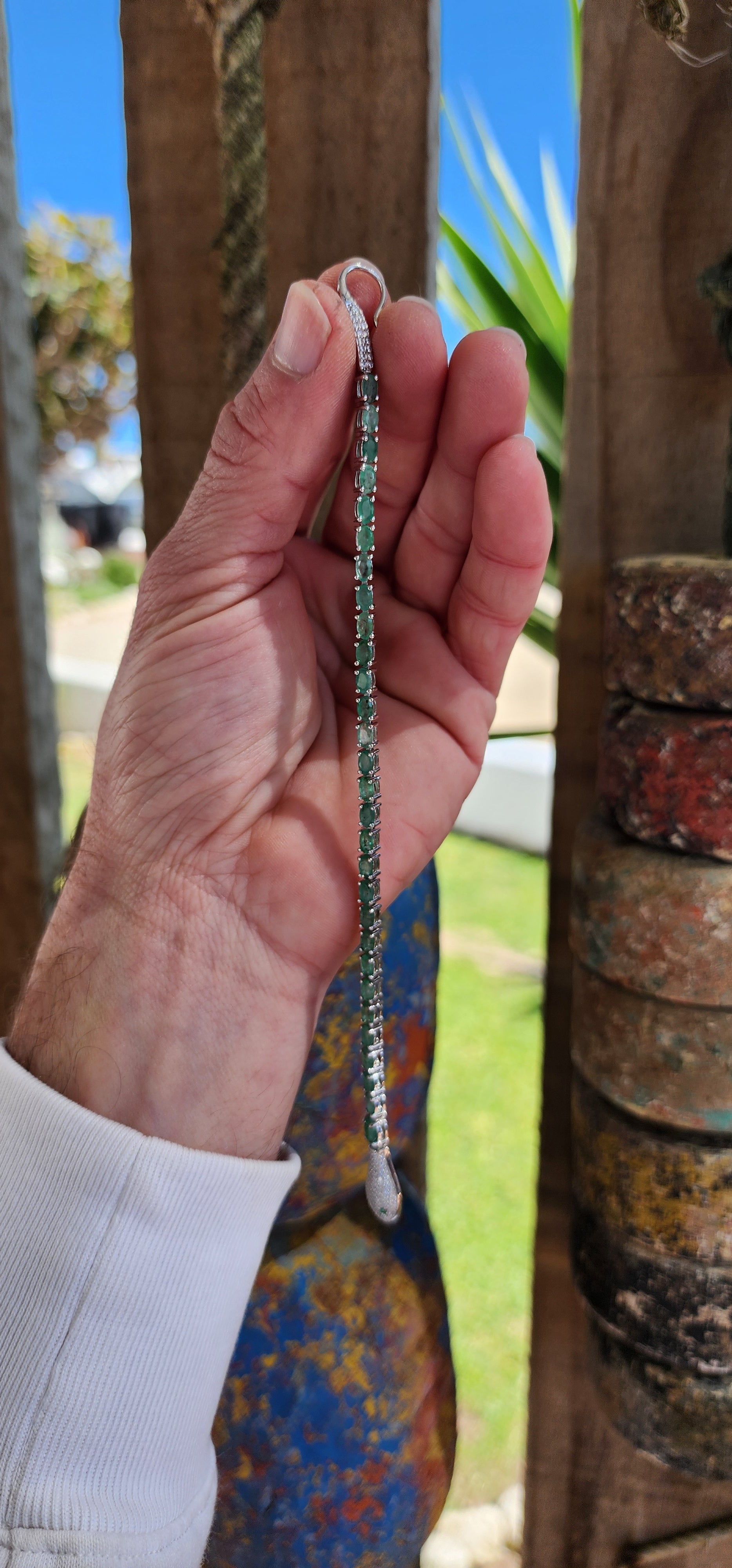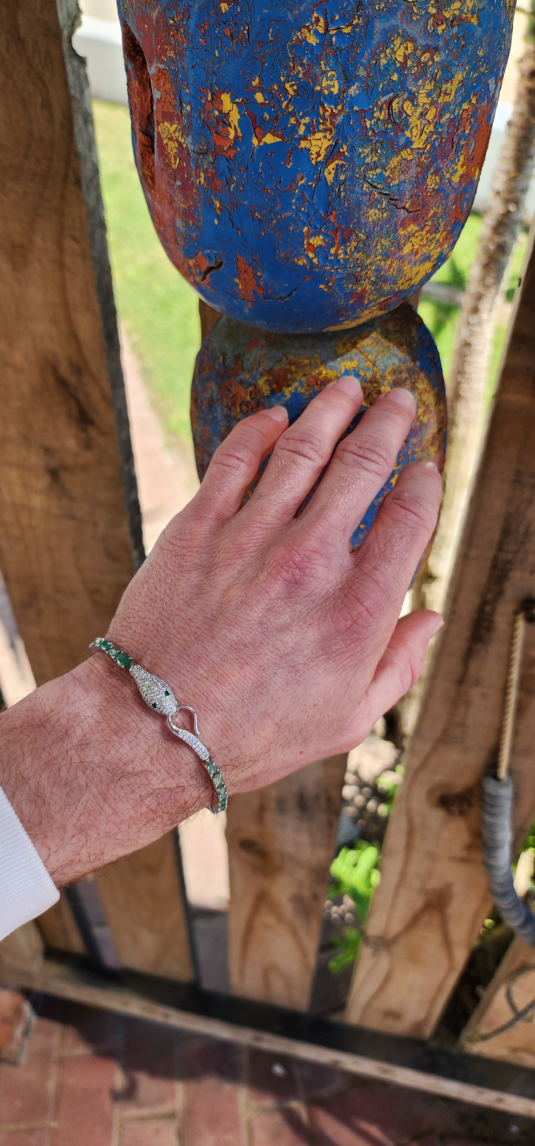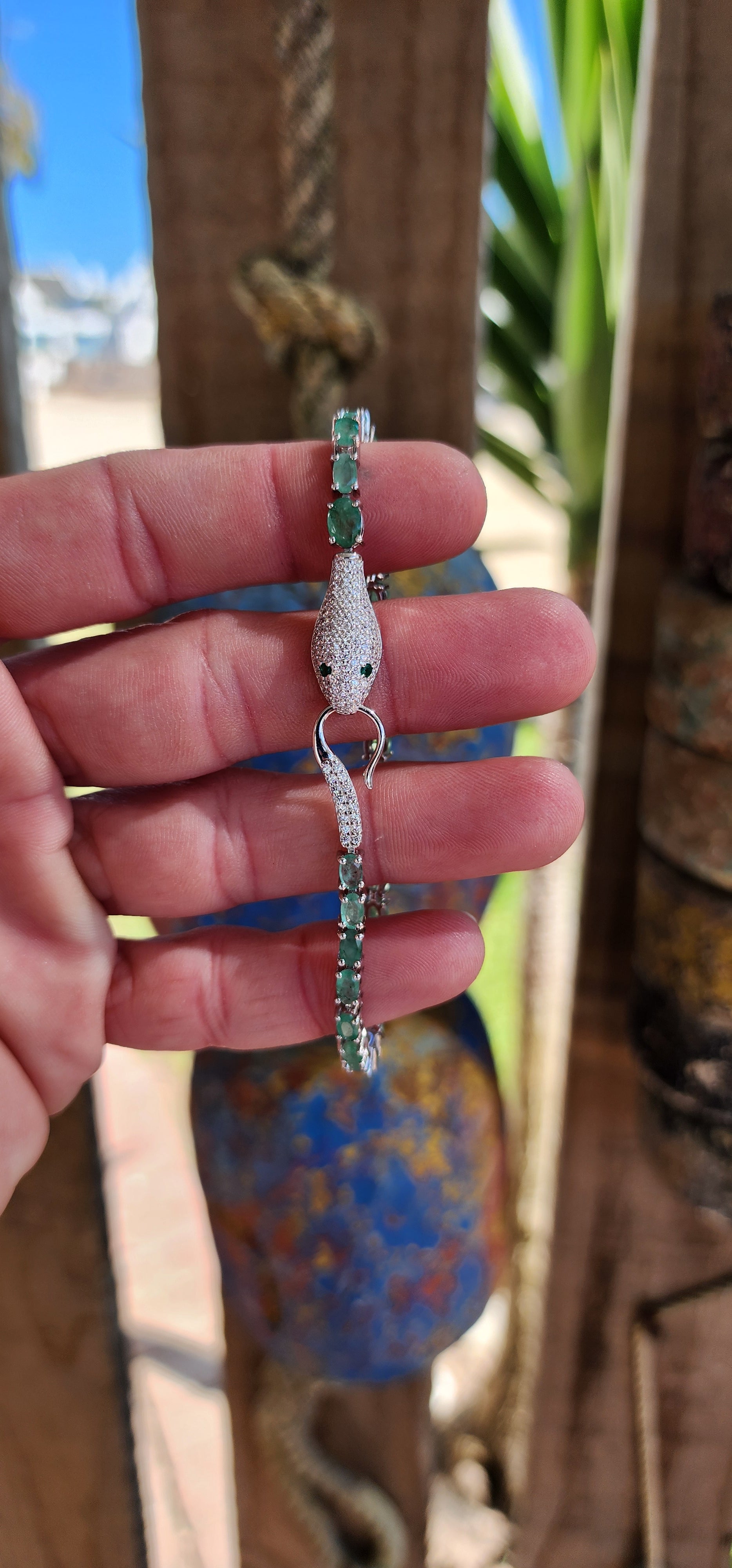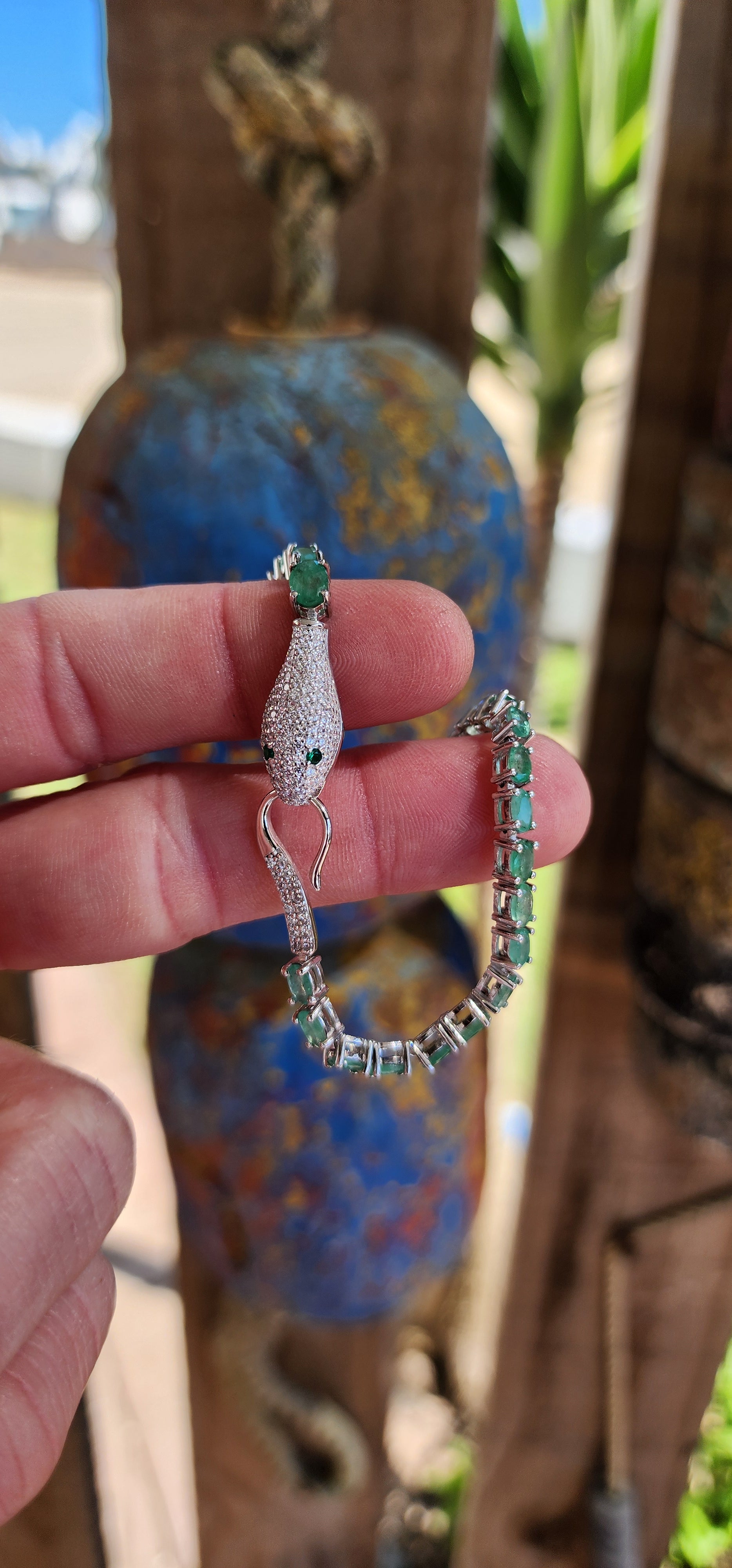 The Serpent face and Shepherds tail clasp ends pave set with sparkly CZ Gemstones and Small Emerald Eyes..The Serpent body featuring 29x Green prong set Oval cut Emerald Gemstones.