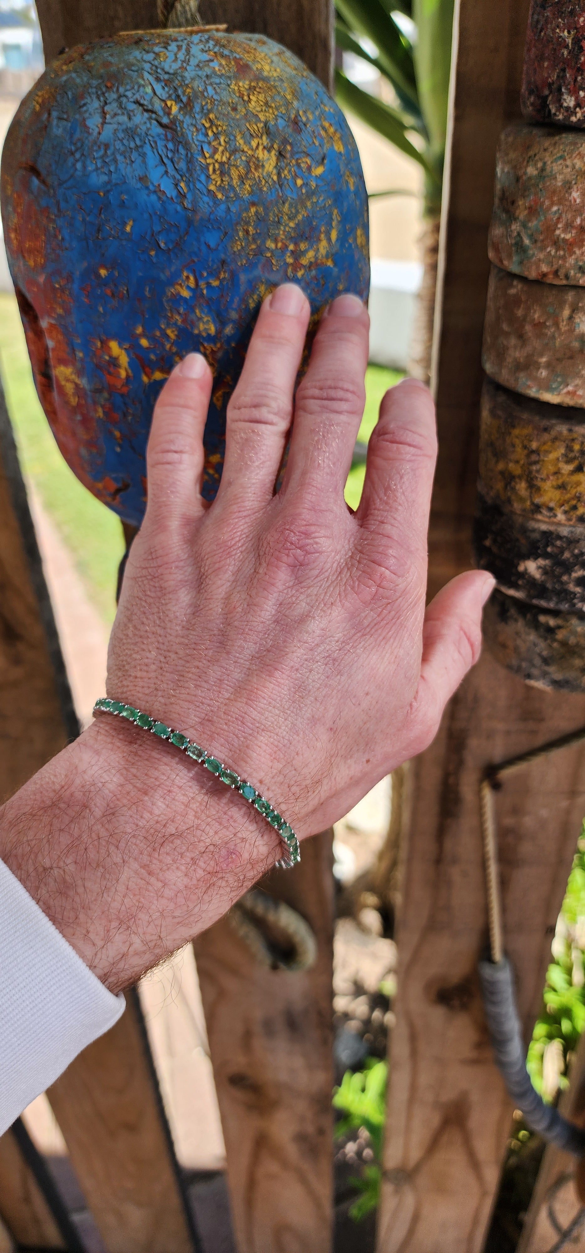 Measurements :Bracelet with a total length of 19cm and 8.91cm wide at widest point.Each of the Oval cut Emerald Gemstones measure 5mm x 3mm each .Bracelet with a total weight of 9.9grams.