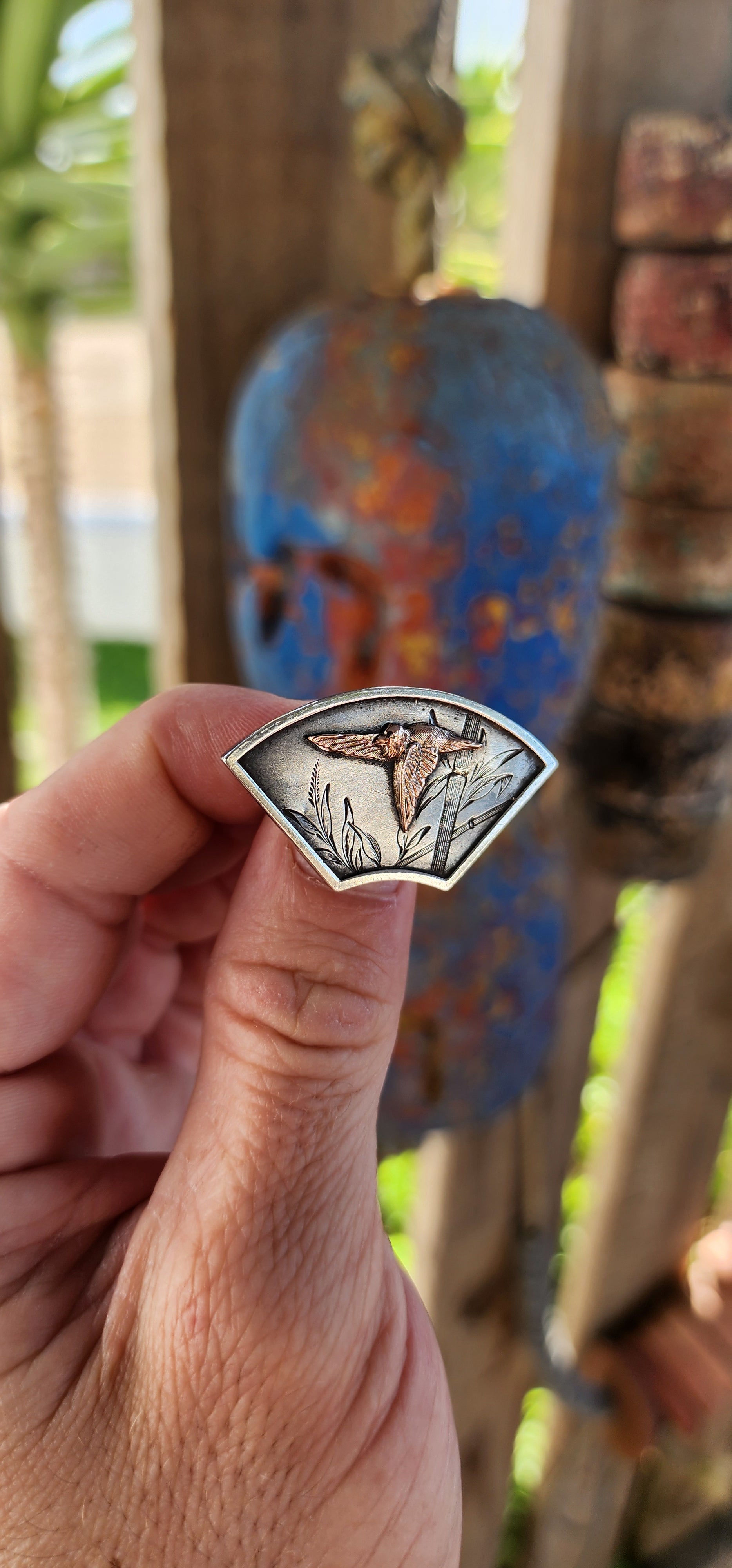 The background features finely engraved reeds and bamboo, which adds to the brooch’s naturalistic theme.