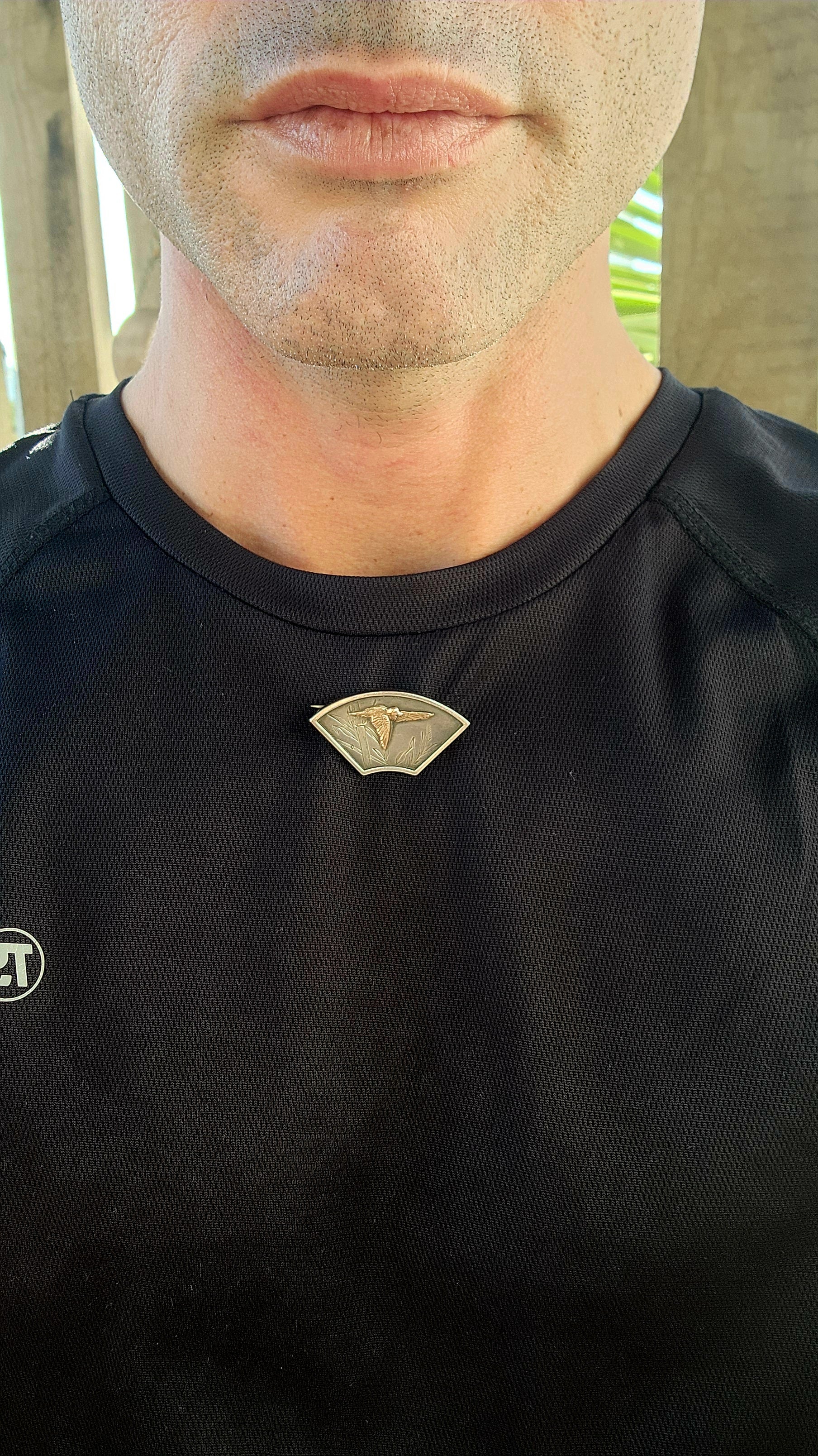 The raised and embossed crane bird is crafted in rose gold, creating a stunning bi-metal contrast against the silver.
