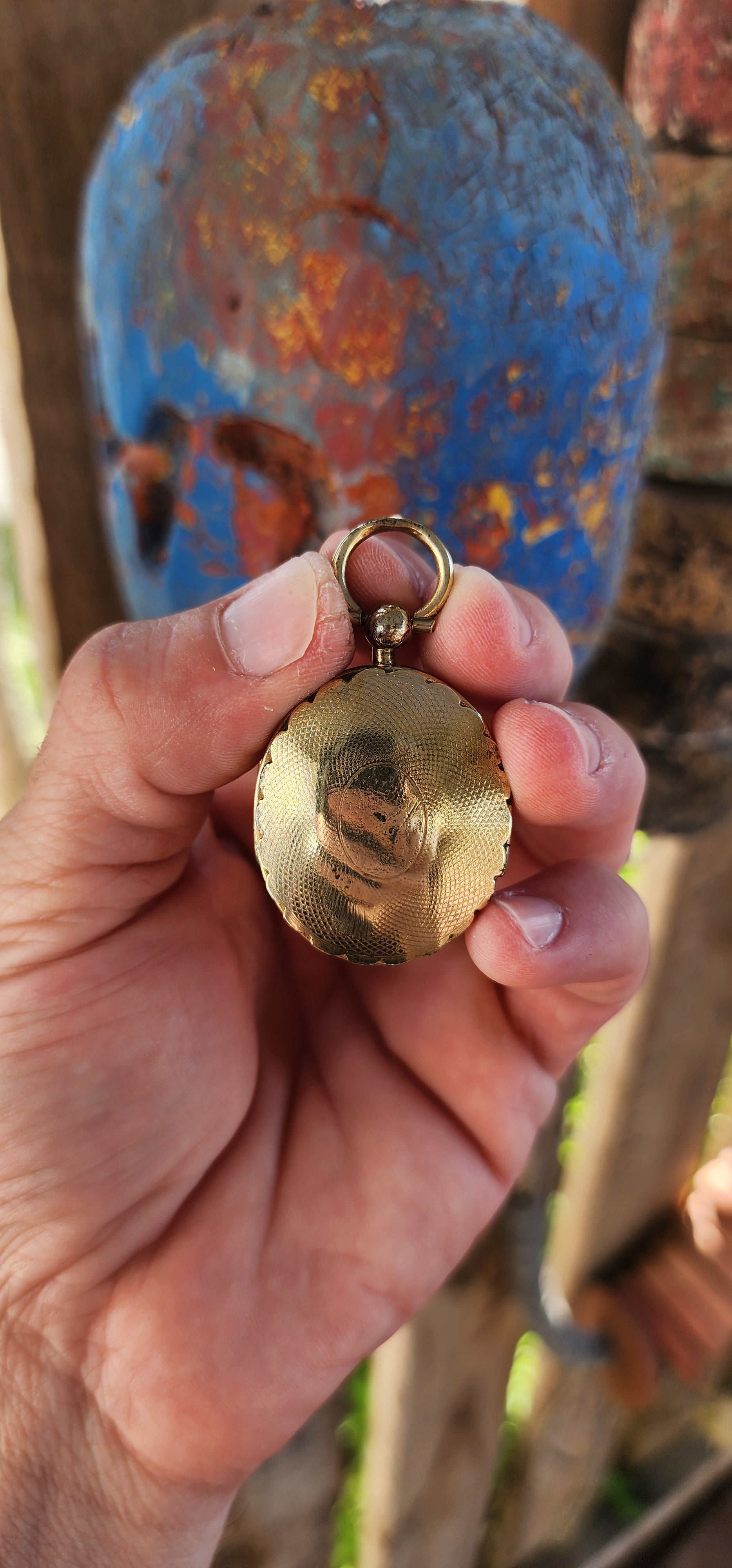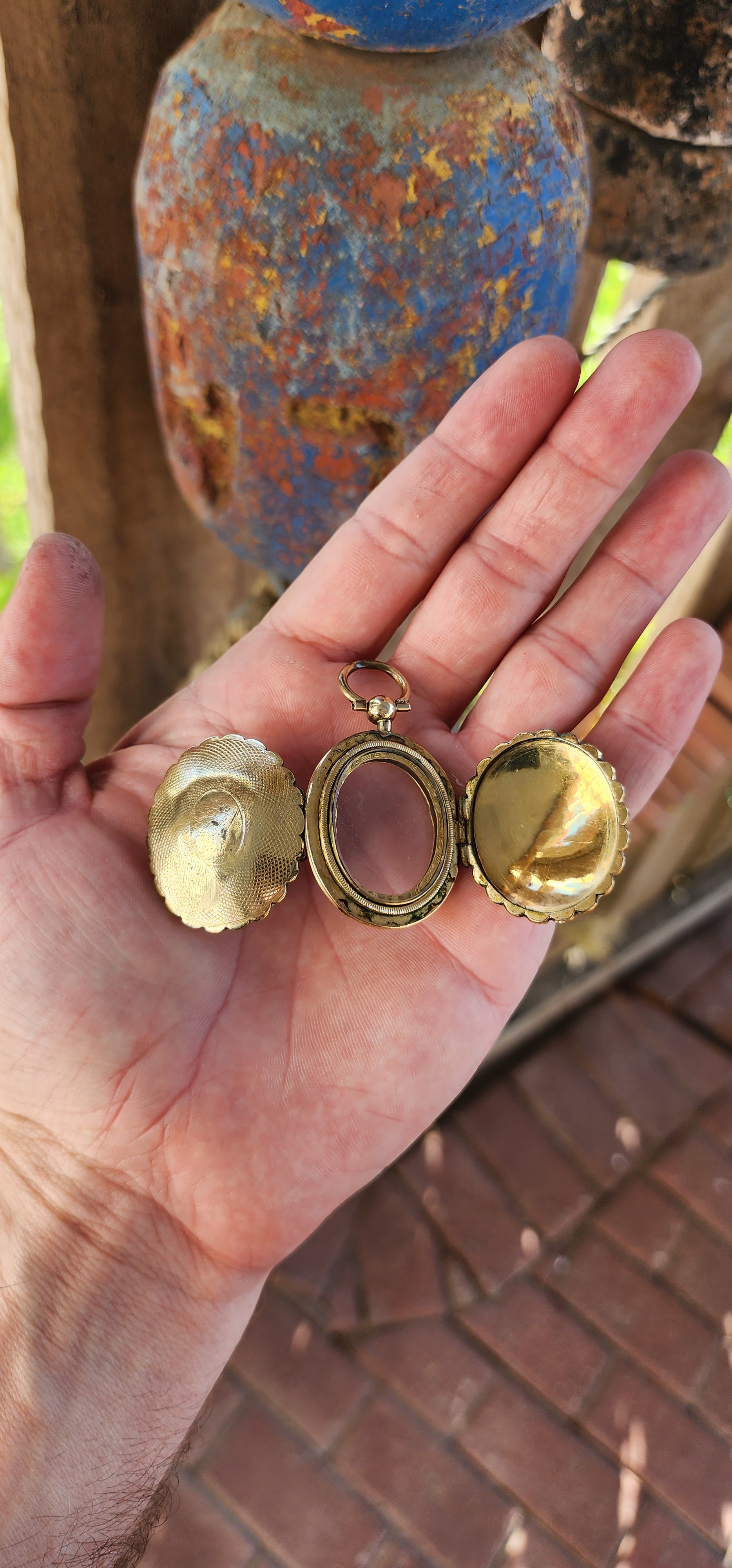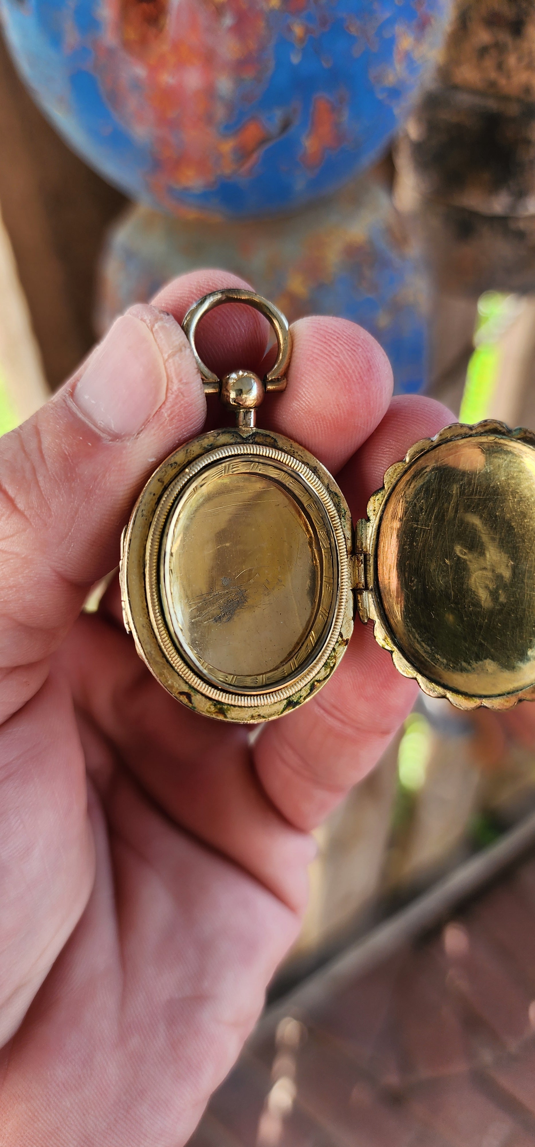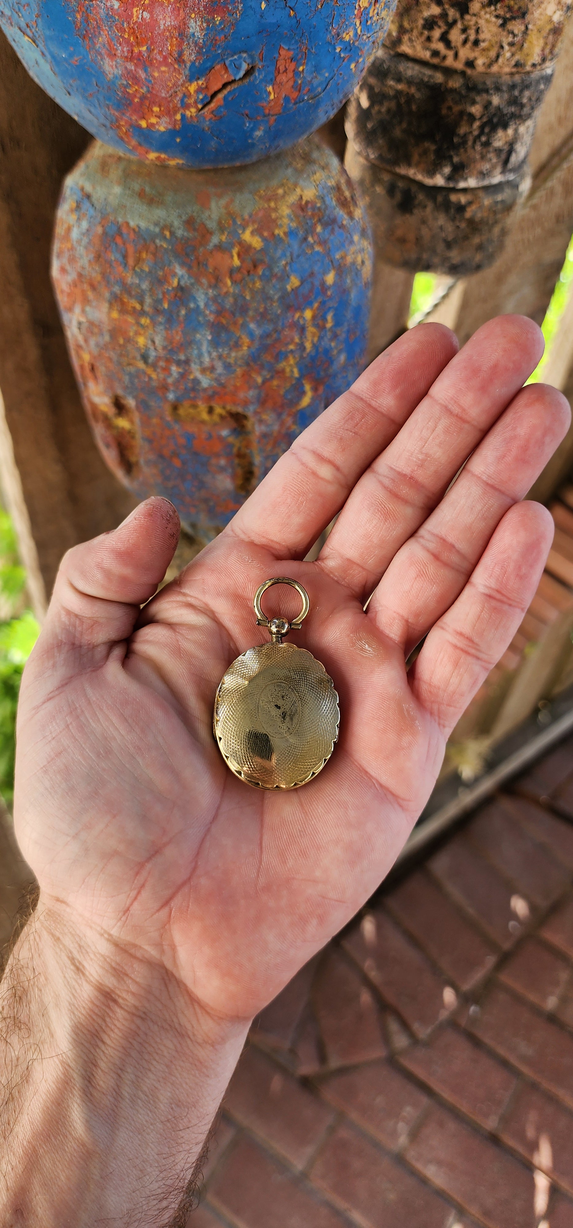 The locket is crafted from Pinchbeck, a special gold substitute alloy developed in the early 18th century by Christopher Pinchbeck. This material was highly prized during the Georgian and Victorian eras for its gold-like appearance while being more affordable.