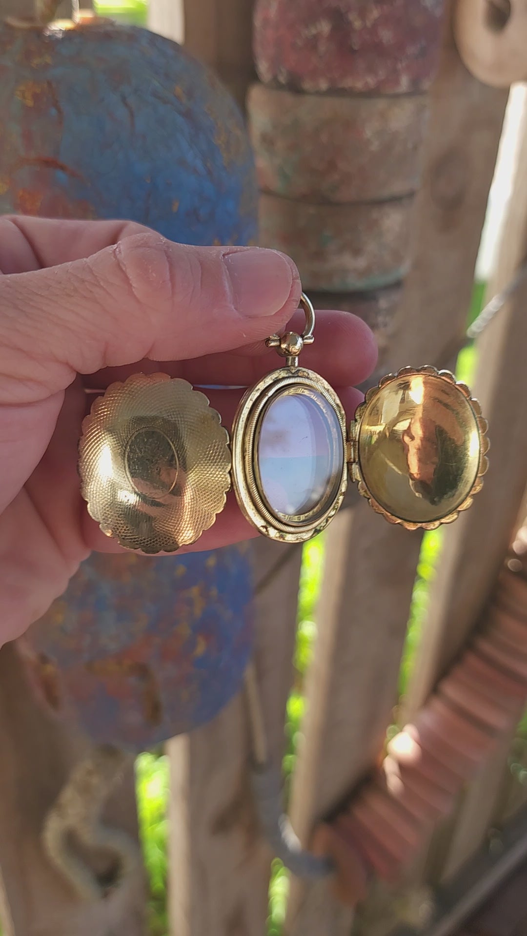 This is a double keepsake locket, meaning it opens from both sides, a rare and desirable feature. Inside, there is a central keepsake holder designed to hold special mementos, such as a lock of hair, a pressed flower, or a small portrait.