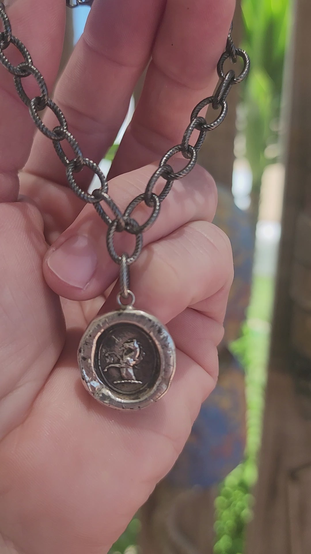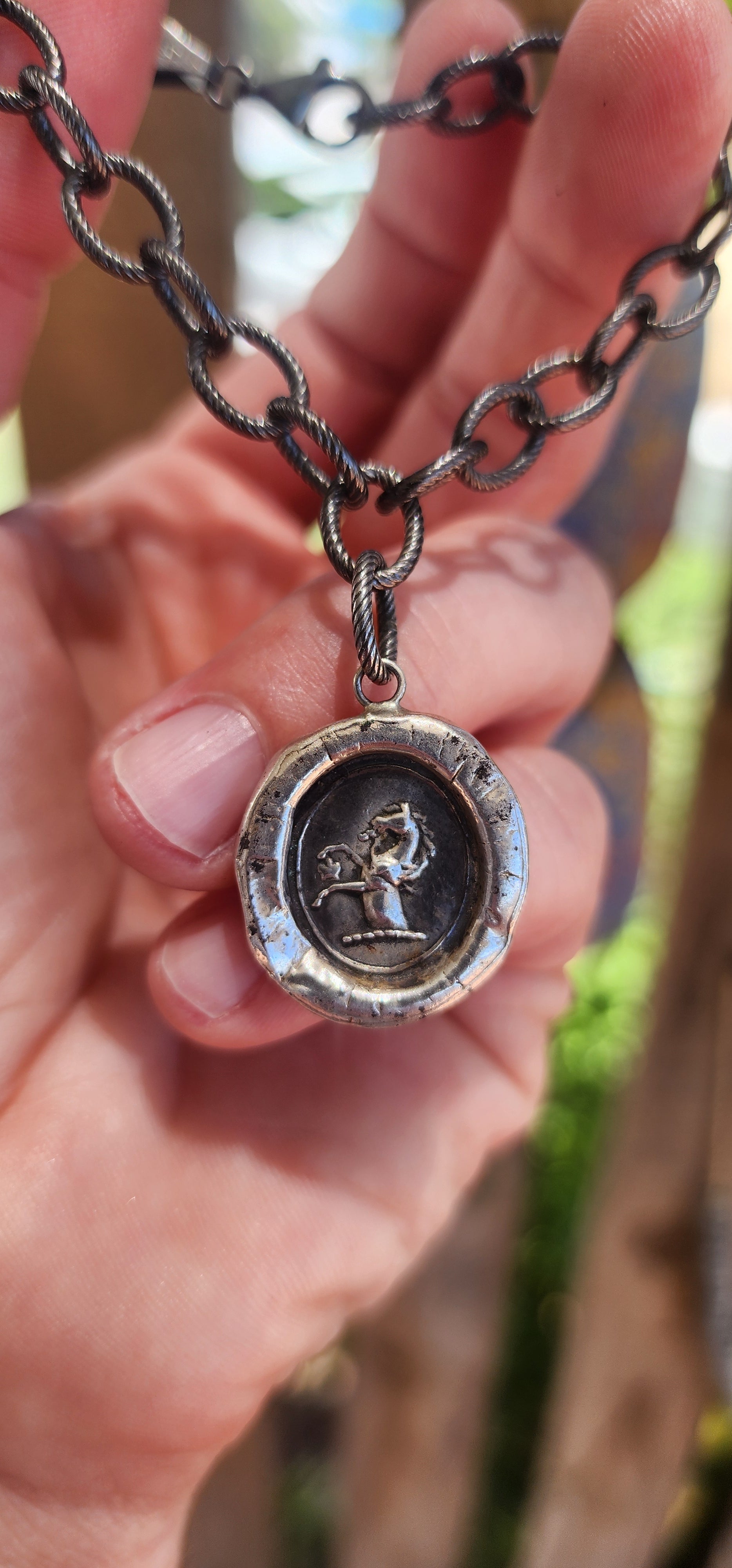 The centerpiece of this bracelet is a stunning handcrafted sterling silver pendant, derived from the impression of an antique Victorian wax seal. The design captures a rearing horse, a classic symbol of unbridled passion, freedom, power, and beauty. The detailing is exquisite: the horse’s mane flows gracefully, its muscular form frozen in mid-motion, embodying vitality and elegance. The slightly irregular edges of the pendant nod to its handcrafted origins, giving it a rustic, ancient appeal reminiscent of wax seals used in nobility.
