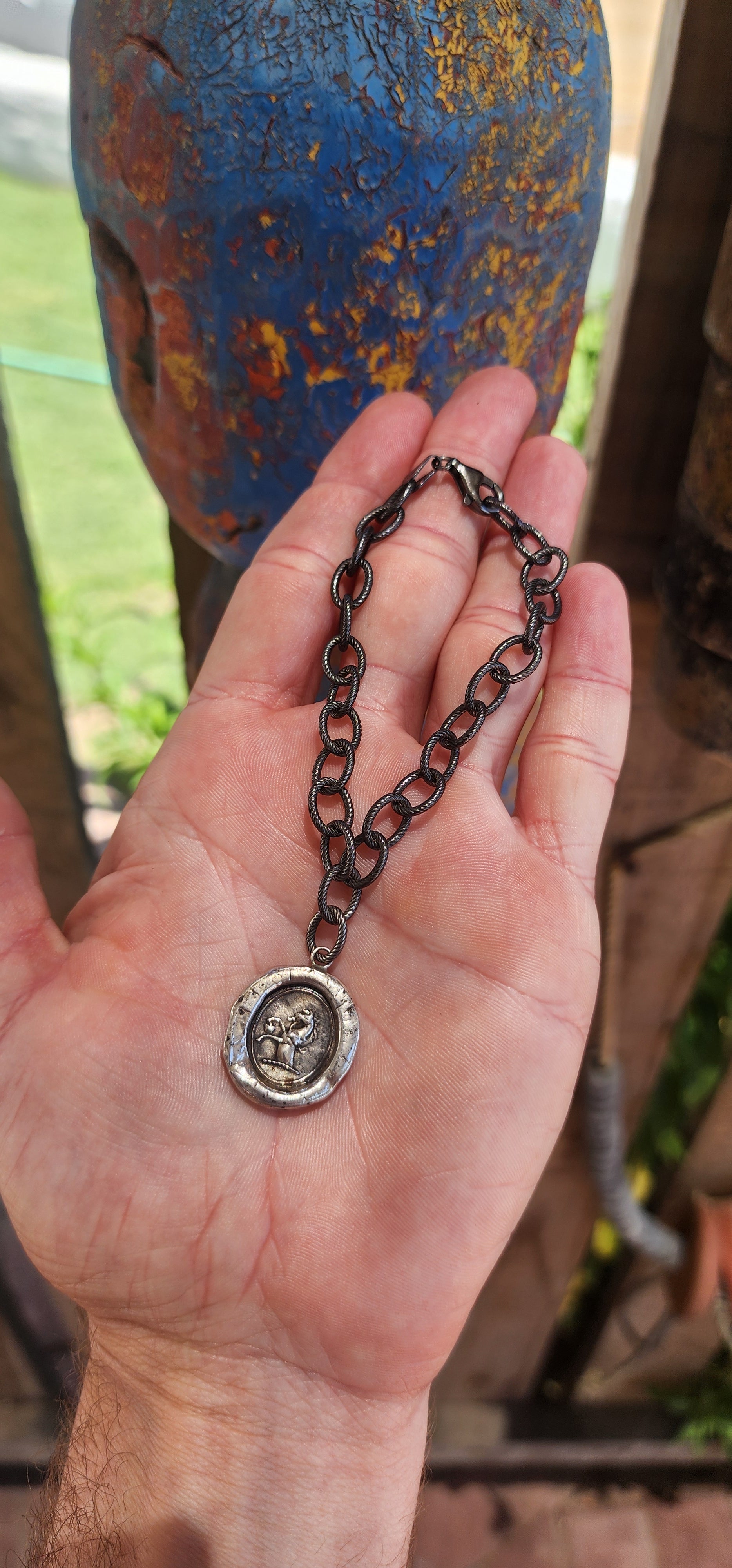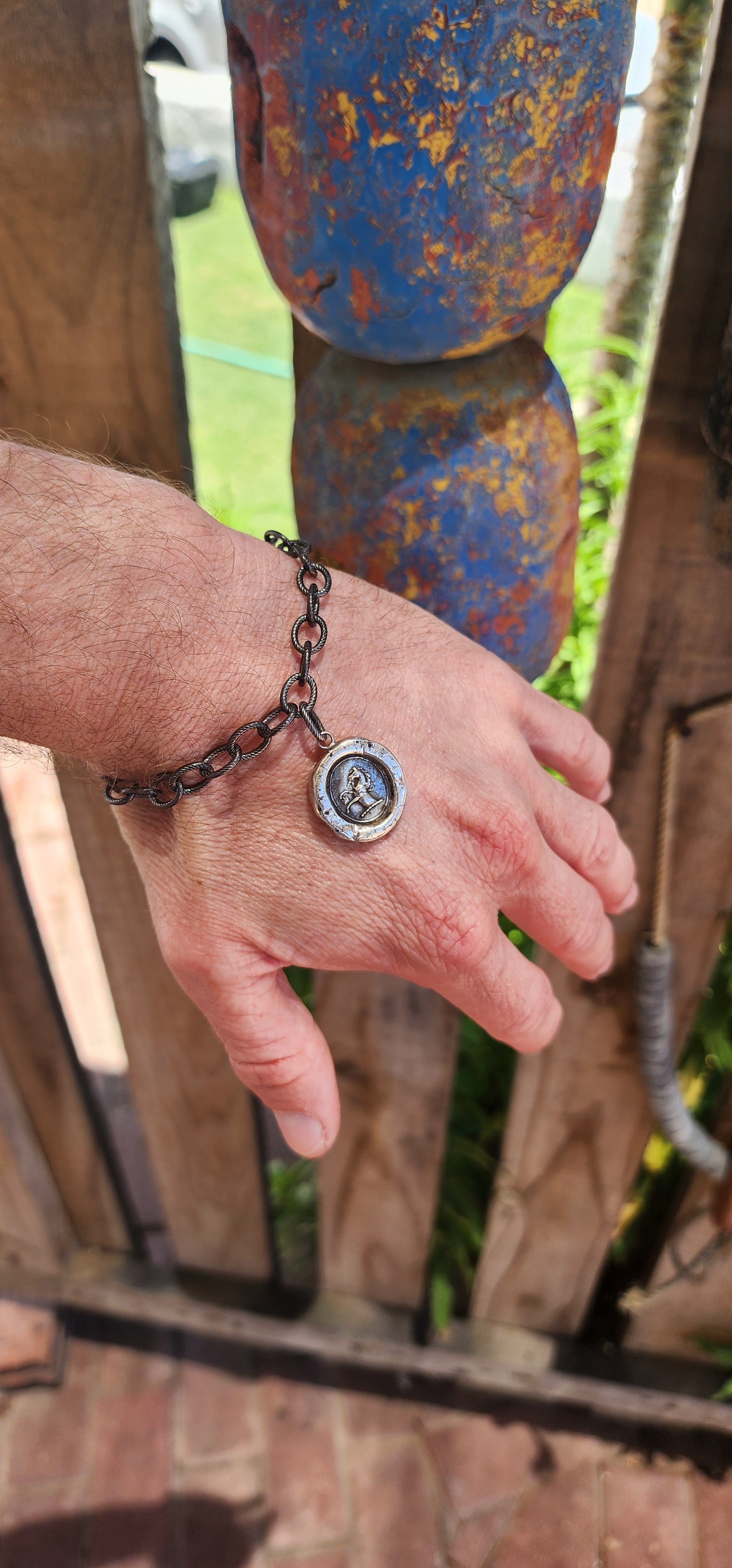 This artisan-crafted sterling silver bracelet with heraldic wax seal pendant is a wearable work of art, steeped in historical charm and symbolic meaning.