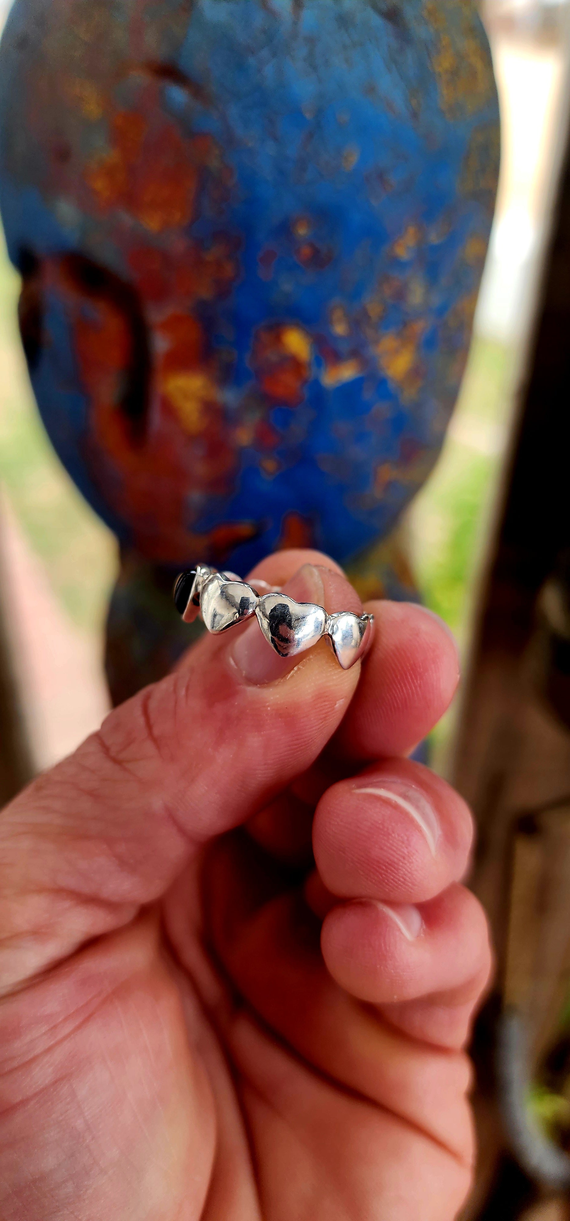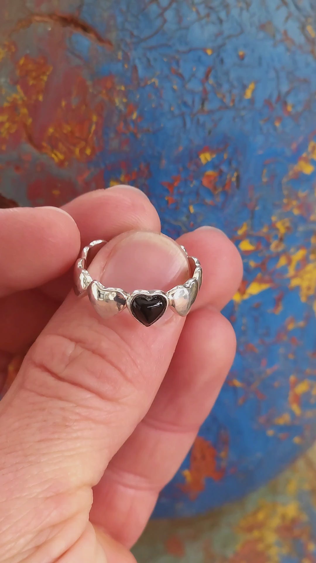 Measurements : The ring measures as a size S as per ring measure stick and 6.80mm wide.The onyx heart measures 6mm x 5mm.The ring with a weight of 4.4grams.