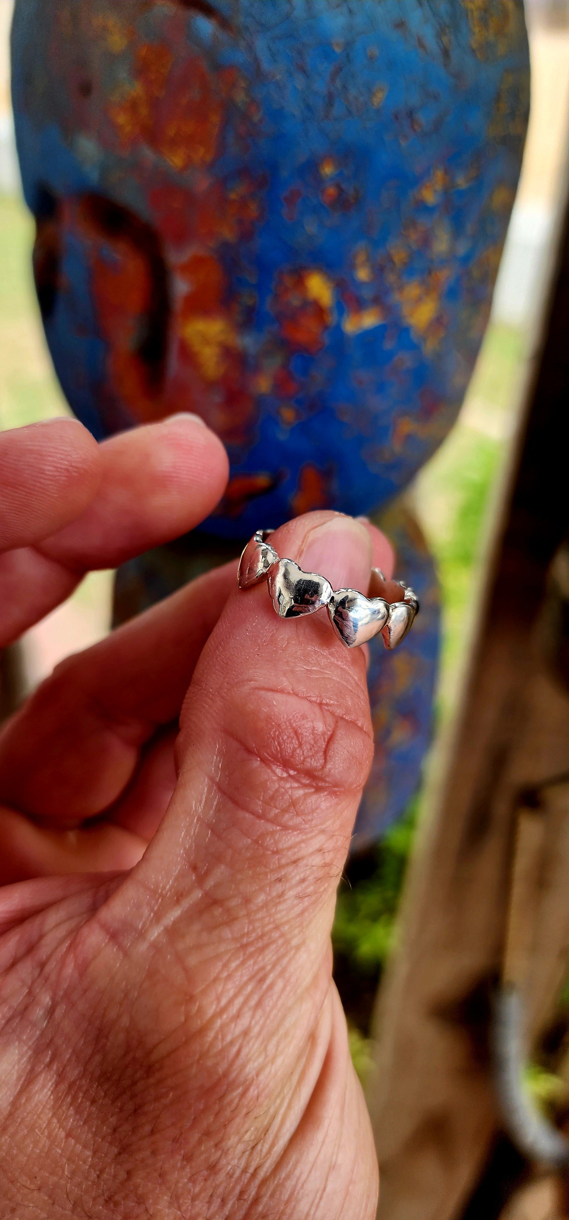 This artisan-made sterling silver ring is a full eternity style band featuring softly domed silver hearts wrapping all the way around the finger — a continuous circle of love with no beginning and no end.