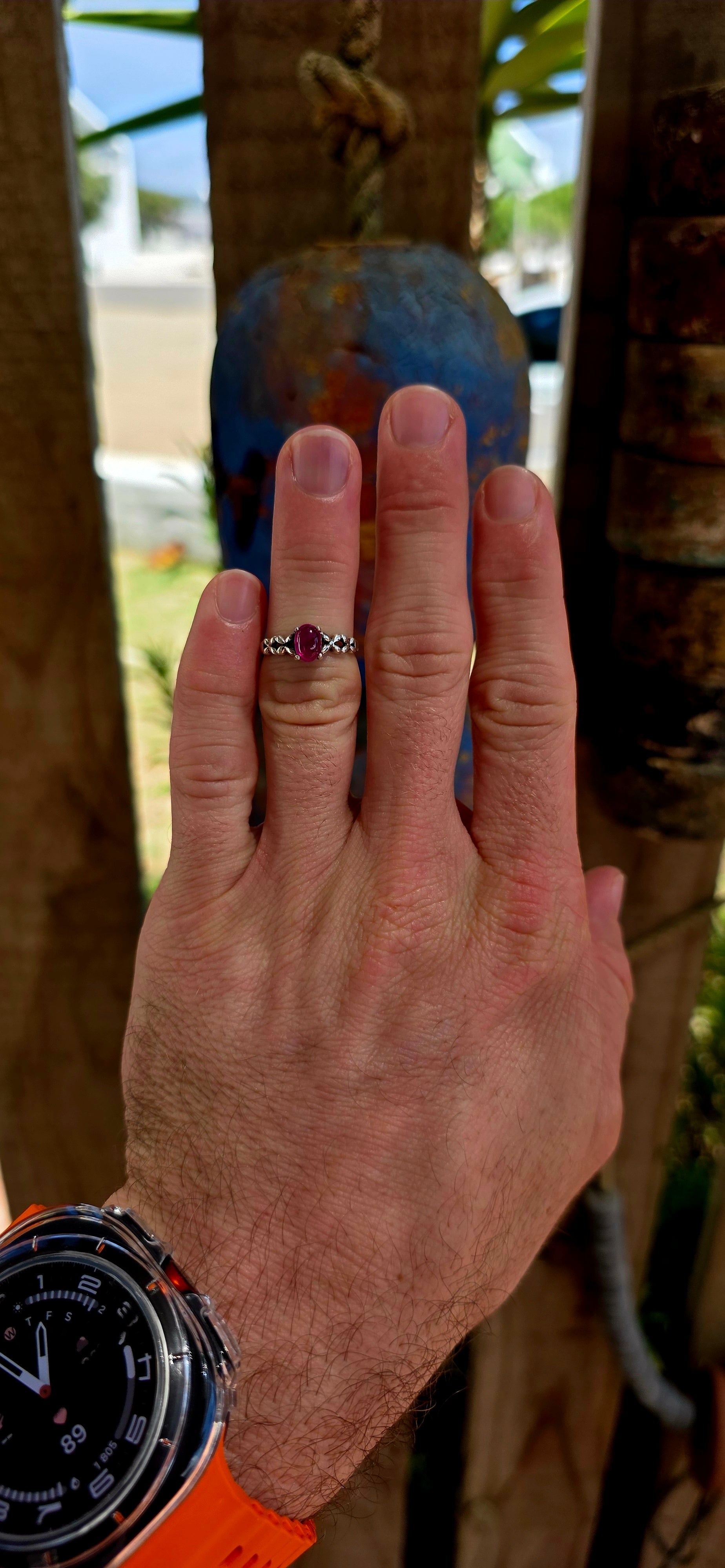 Measurements : The ring measures as a size L and half as per ring measure stick.The ruby cabochon measures 6.80mm x 5mm.The rinf with a weight of 1.9 grams.