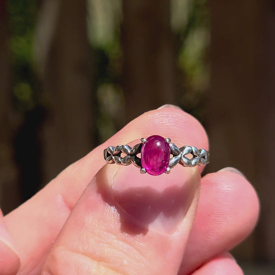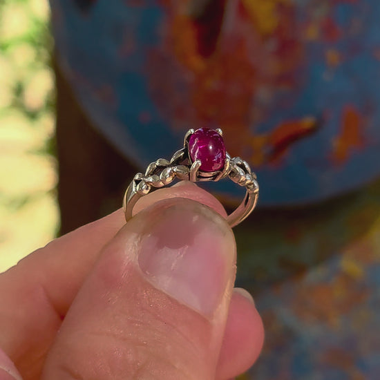 This beautiful sterling silver solitaire-style ring features a glowing oval-cut ruby cabochon, prong-set proudly at the centre