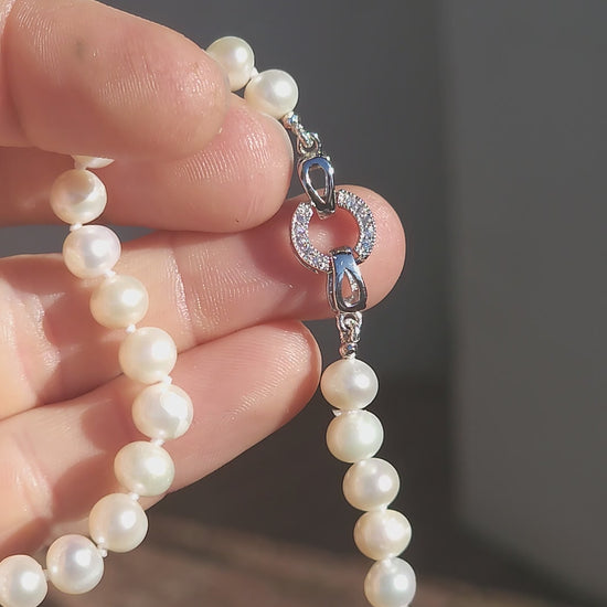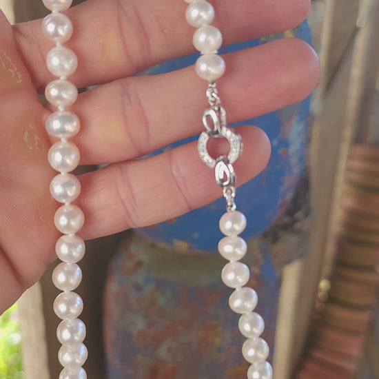 The focal point is the sterling silver enhancer clasp, designed in a modern double-loop style. It is embellished with sparkling pavé-set cubic zirconia, which lends an extra touch of radiance. This clasp not only secures the strand but also serves as an elegant design element in its own right—meant to be worn proudly in front, rather than hidden behind the neck.