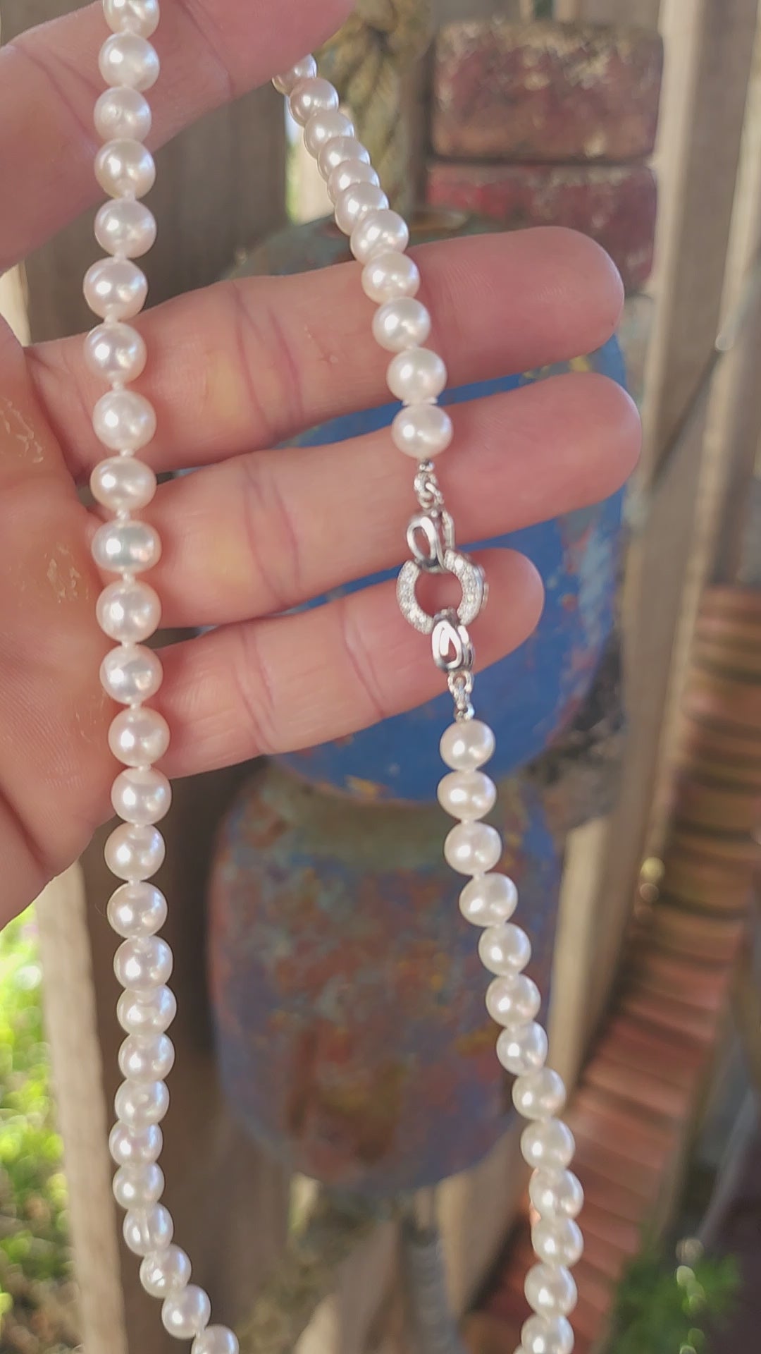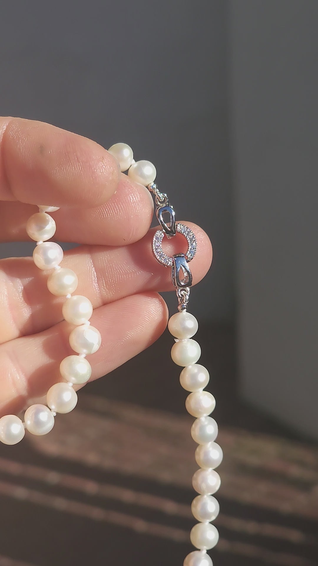Each pearl is semi-round in shape with a soft, lustrous glow that reflects natural light beautifully. The strand is hand-knotted on white silk, ensuring both durability and fluid drape while also preventing the pearls from rubbing against one another.