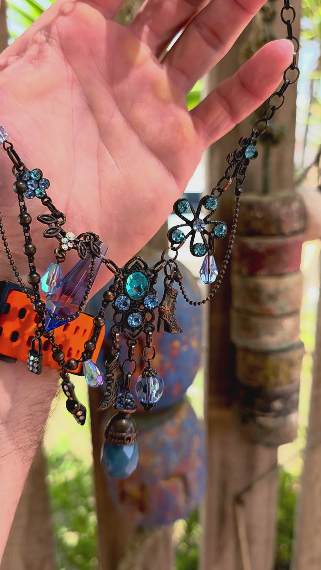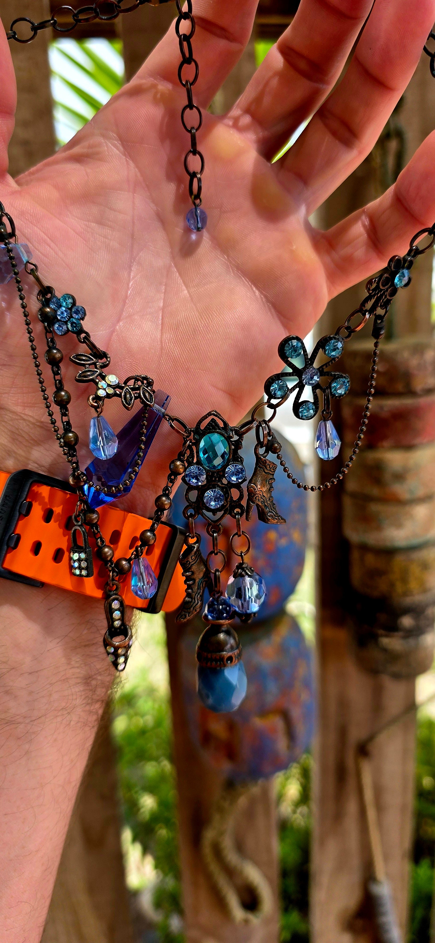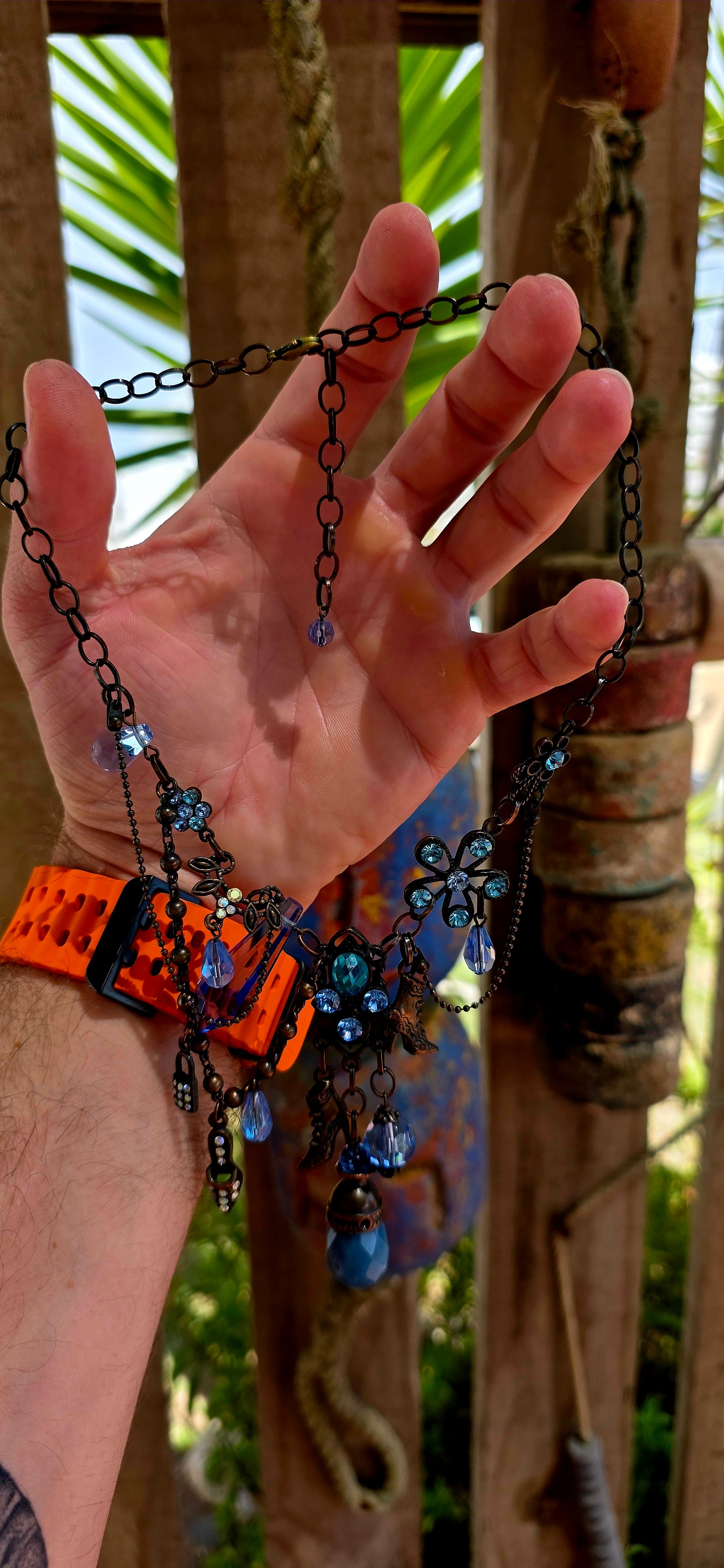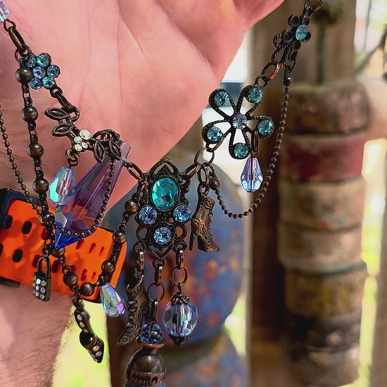 It has that boho-meets-fairytale-meets-runway energy — like a charm bracelet decided to become a necklace and go out dancing.
