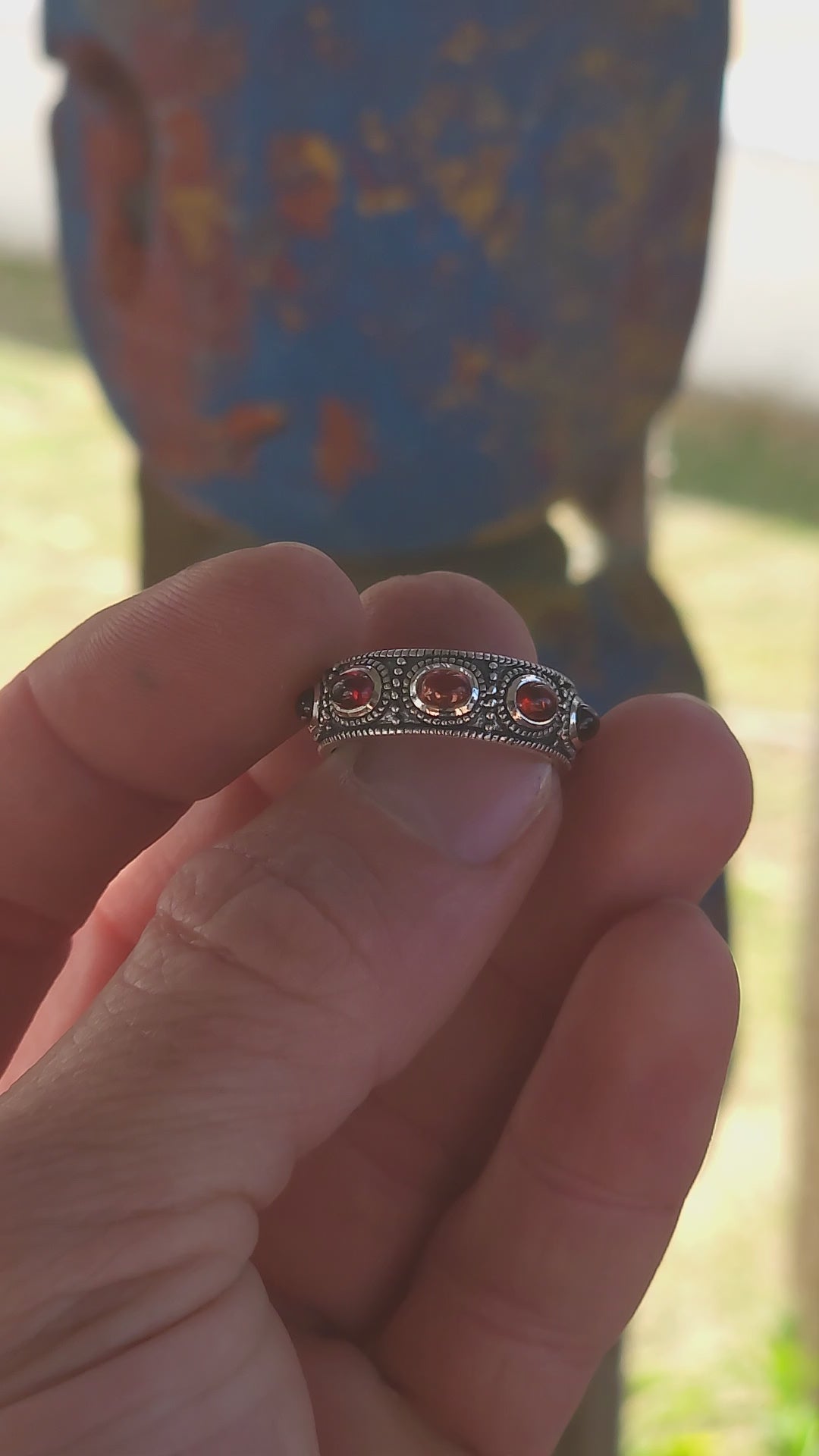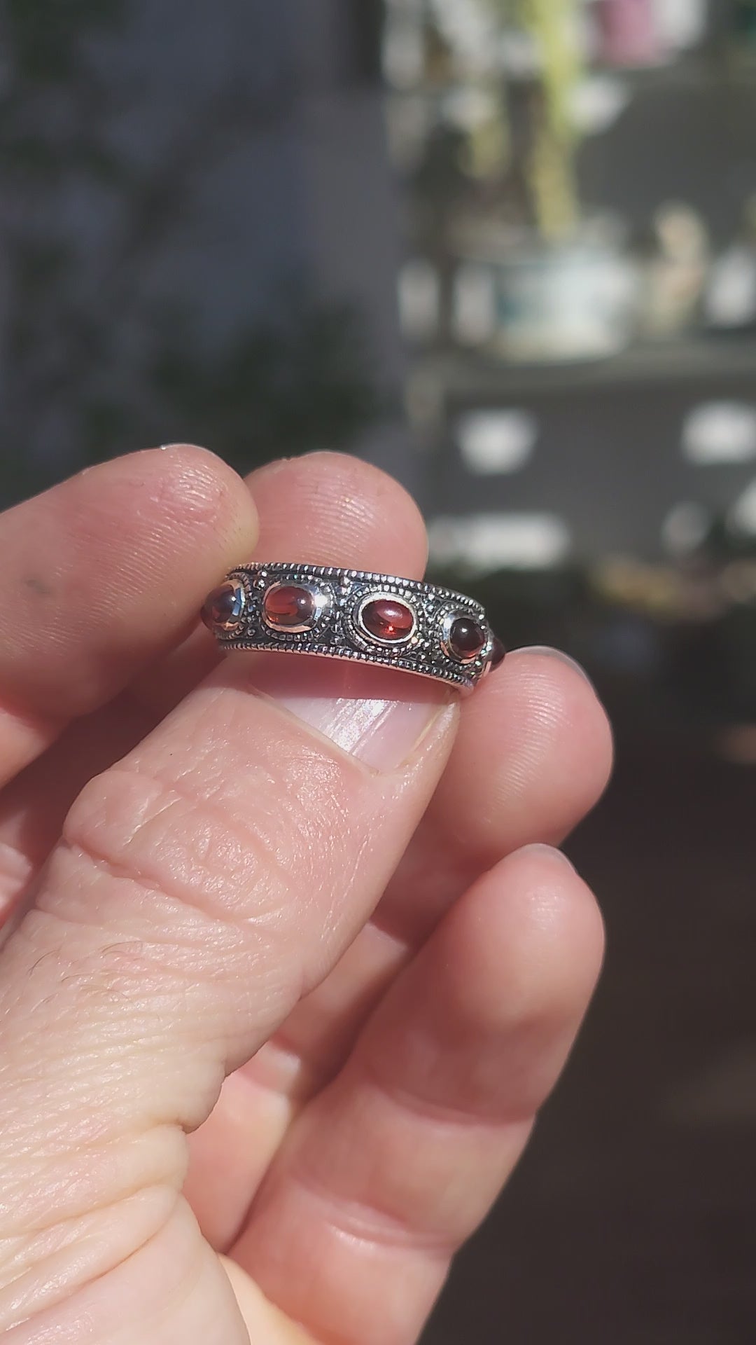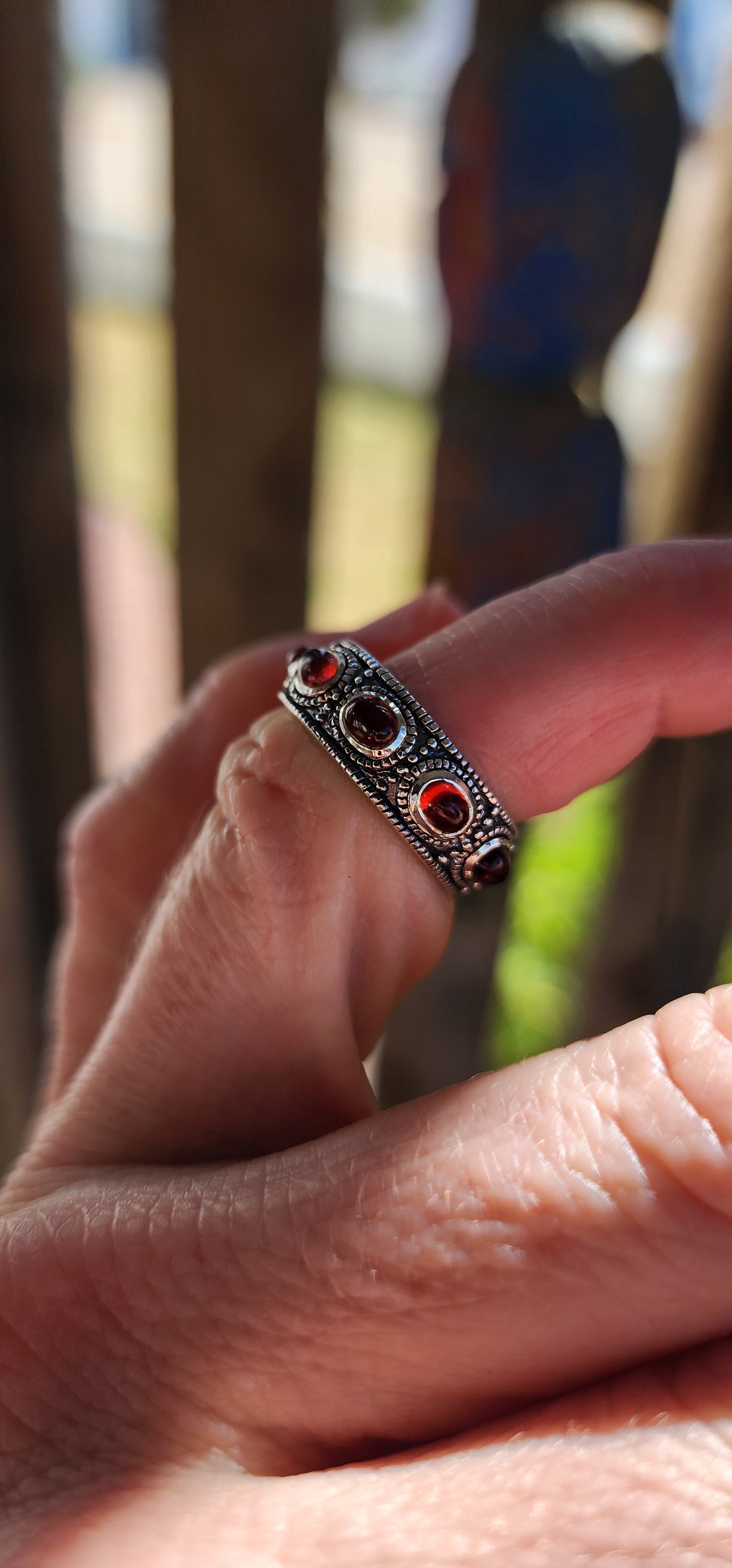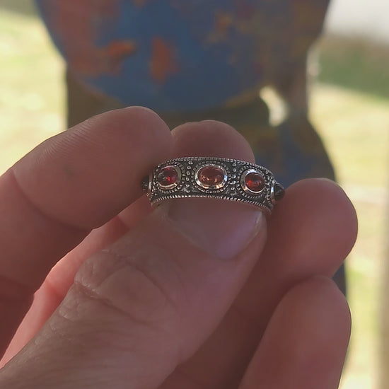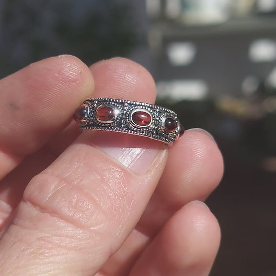 Between each garnet, the band is adorned with beaded borders and delicate silver separators, all finished with moody black oxidisation that sinks into the details and gives this ring its irresistible gypsy, vintage, rock-and-roll soul. It’s the kind of ring that looks like it’s lived a few past lives already — and collected stories in every one of them.