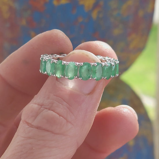 This glorious unisex sterling silver full eternity ring is a never-ending parade of 18 glowing oval-cut emeralds.