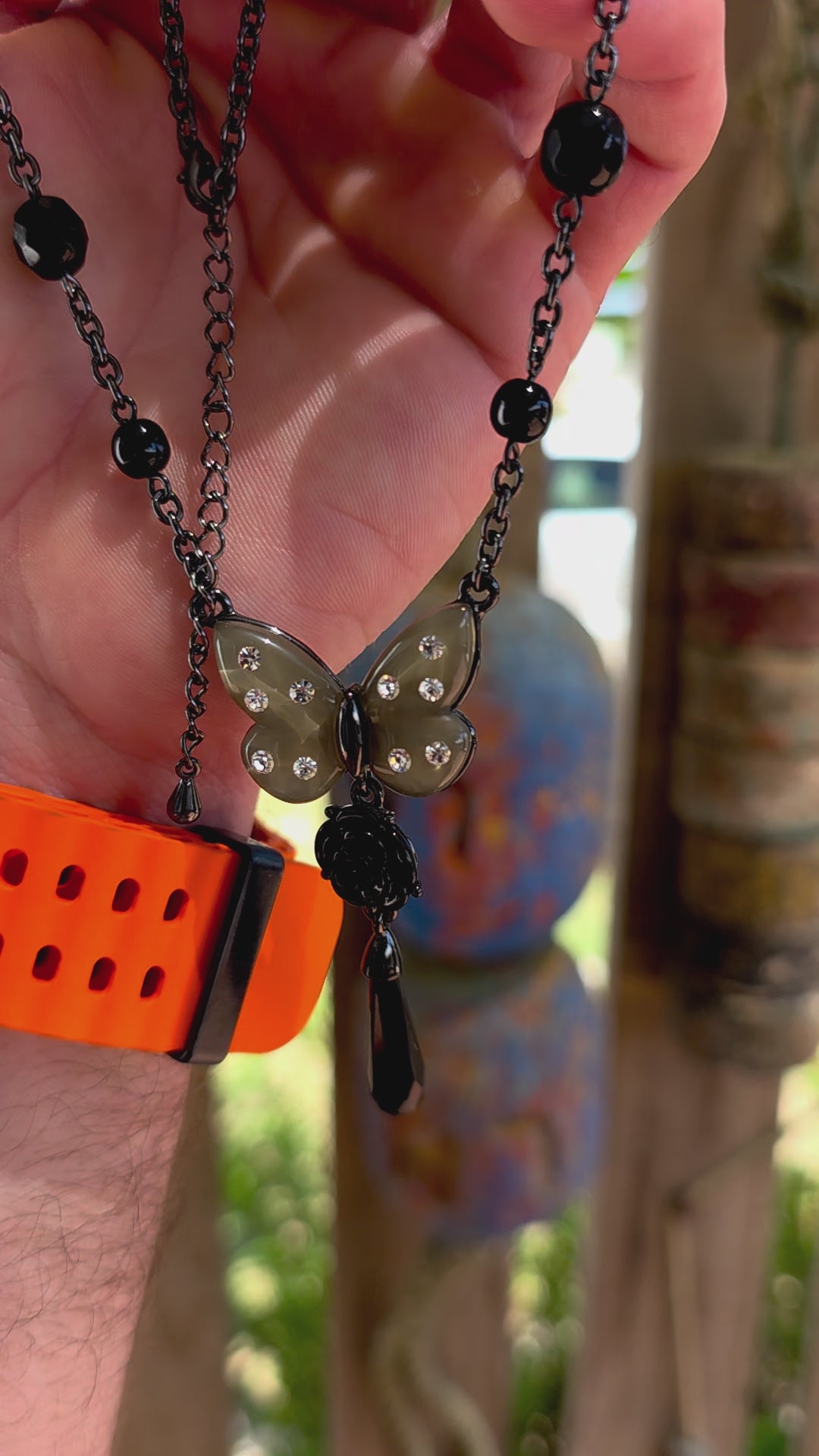 At the centre sits a striking butterfly pendant featuring: