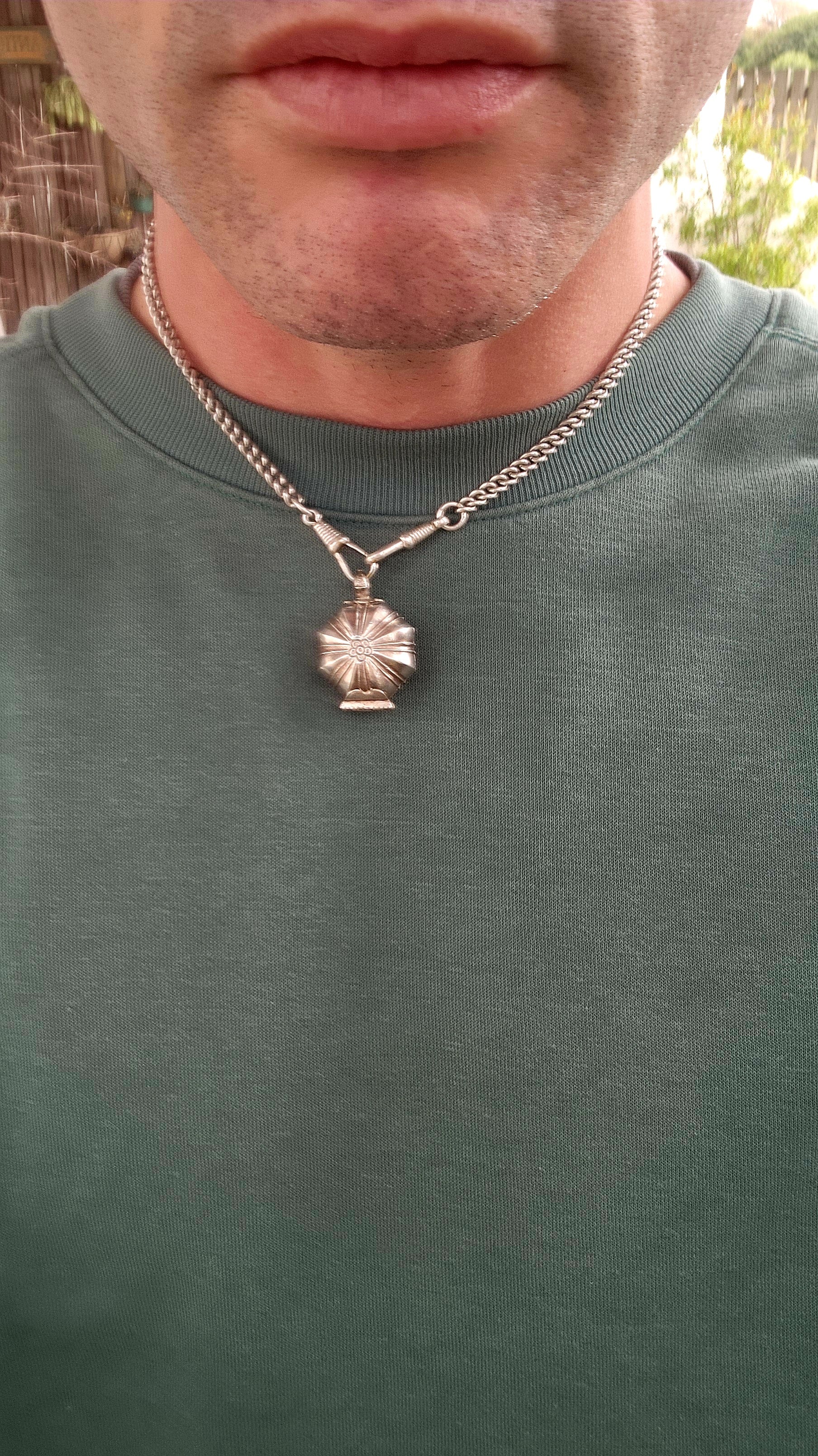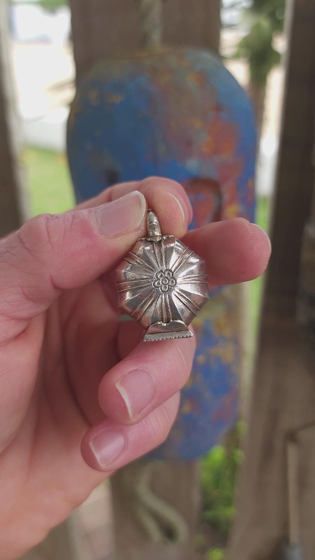 The exterior is deeply decorated with raised geometric lines that give the piece an tribal, organic feel.The front and back displays a beautiful radiating sunburst motif with a central rosette flower, symbolizing vitality and good fortune. The locket opens with a small hinge to reveal a hollow compartment within—its concave form showing wear and patina from use, a testament to its age and authenticity.