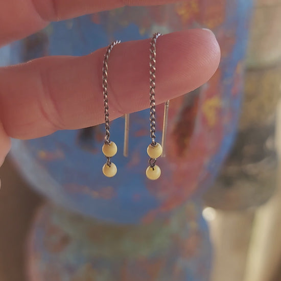 This playful pair of vintage sterling silver threader earrings offers a beautifully balanced mix of sleek metal and warm organic charm. Each earring features a fine, slinky silver chain tipped on one side with a minimalist silver thread-bar, and on the other with two creamy ivory beads stacked in a simple yet striking drop.