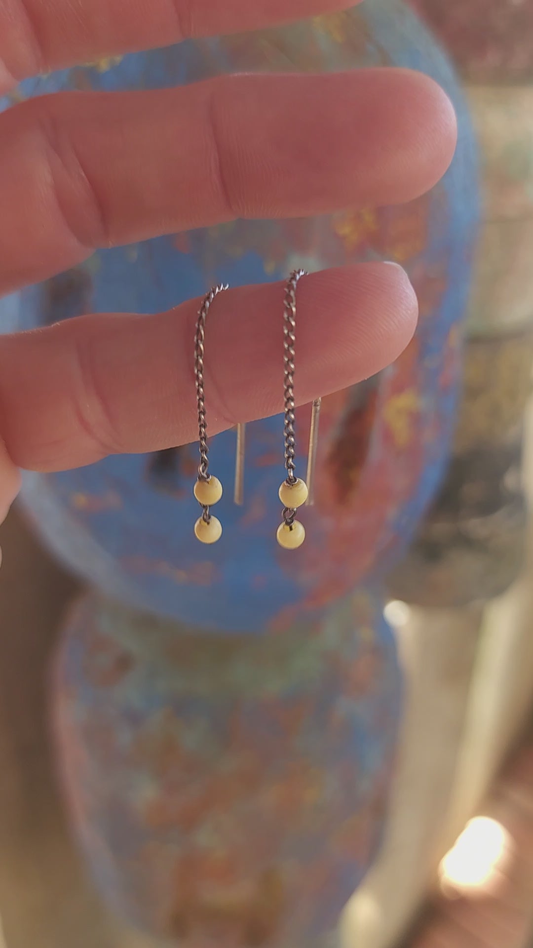 This playful pair of vintage sterling silver threader earrings offers a beautifully balanced mix of sleek metal and warm organic charm.