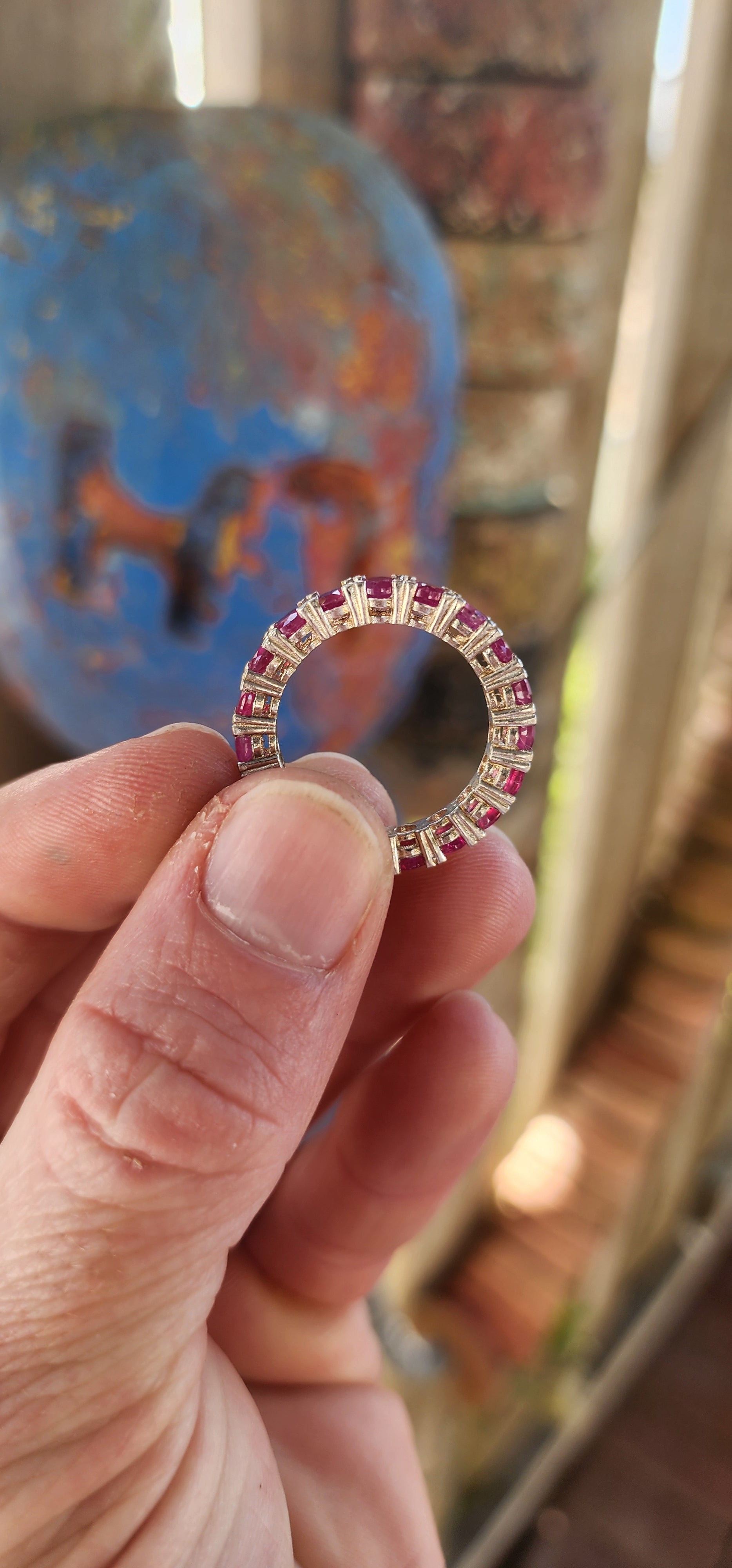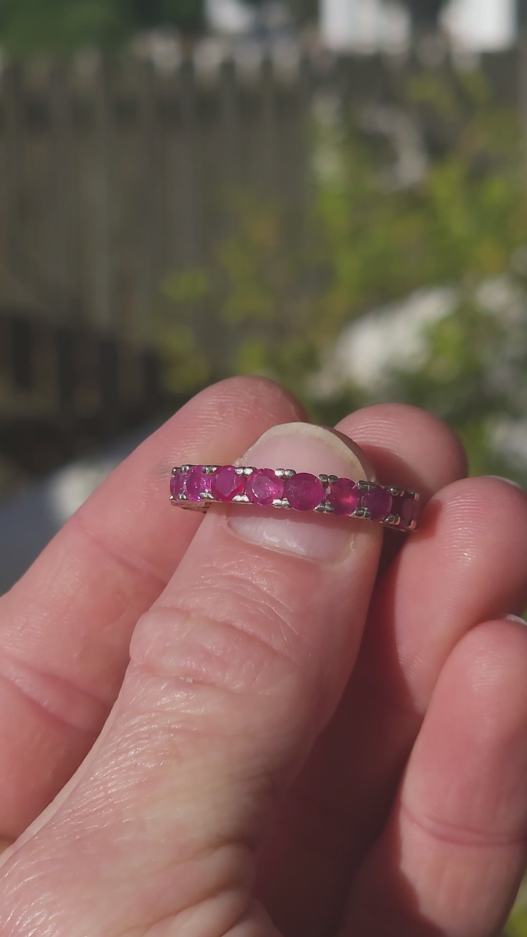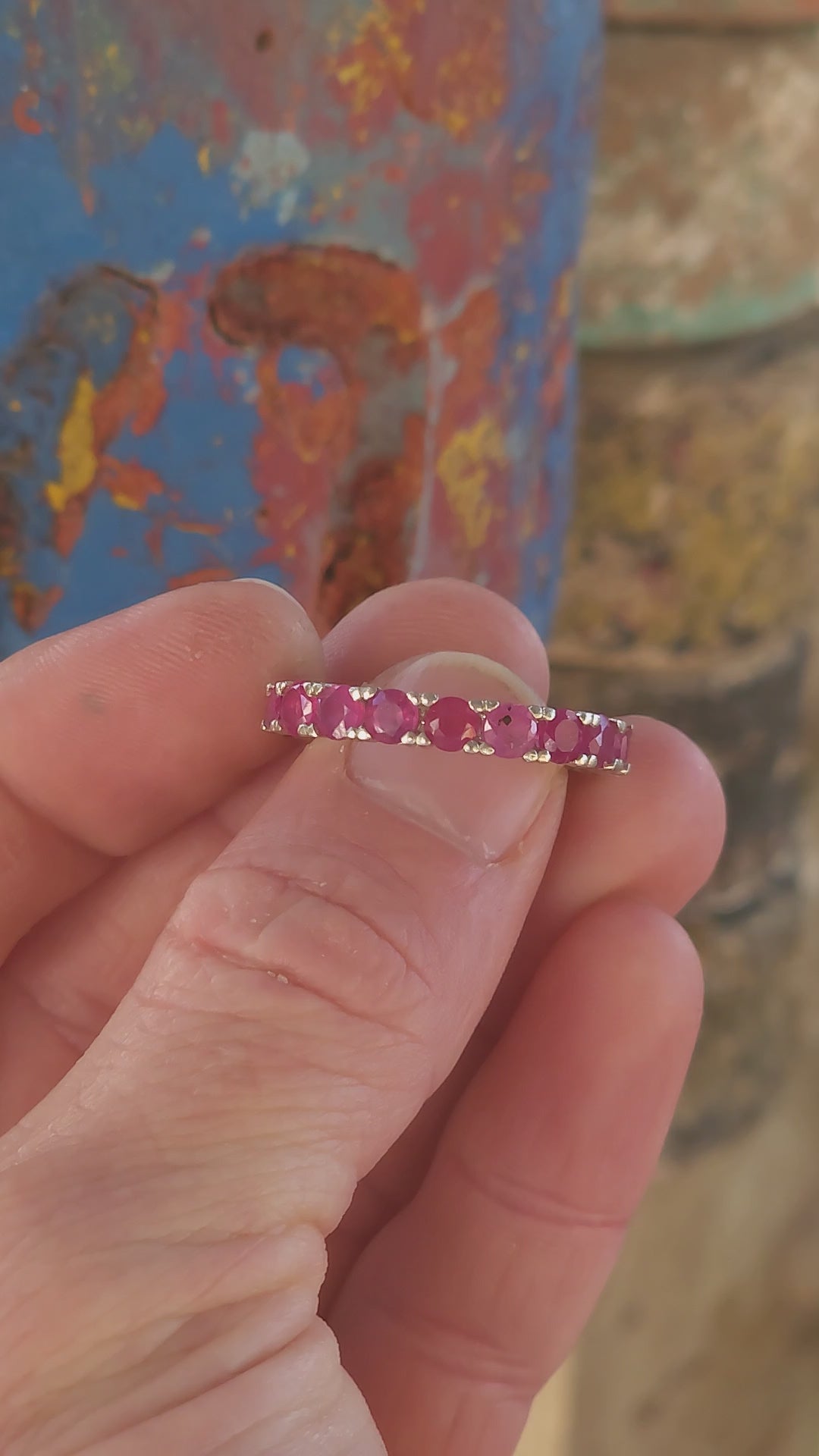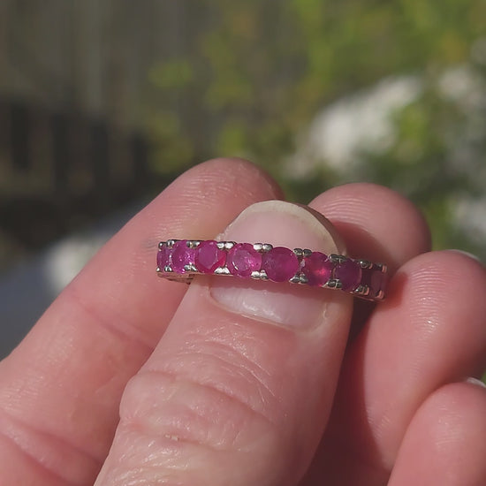 This sterling silver full eternity ring is a true showstopper—crafted with precision and designed to dazzle from every angle. A continuous circle of rich, round-cut rubies is prong-set all the way around, their radiant crimson glow creating a ribbon of passion that never ends. Each ruby shines with a vibrant raspberry-red hue, igniting a spark of confidence and energy every time you catch a glimpse of it.