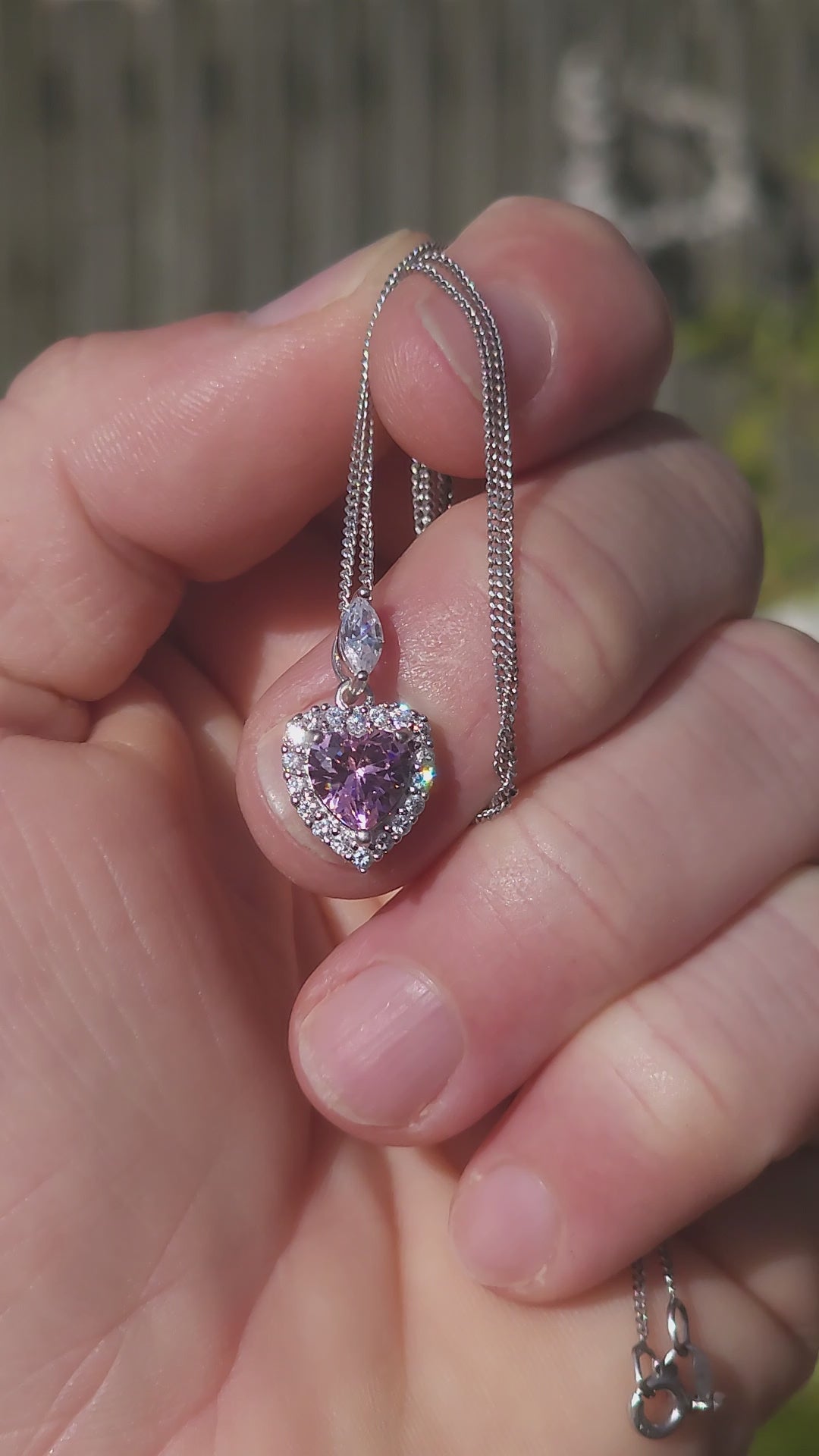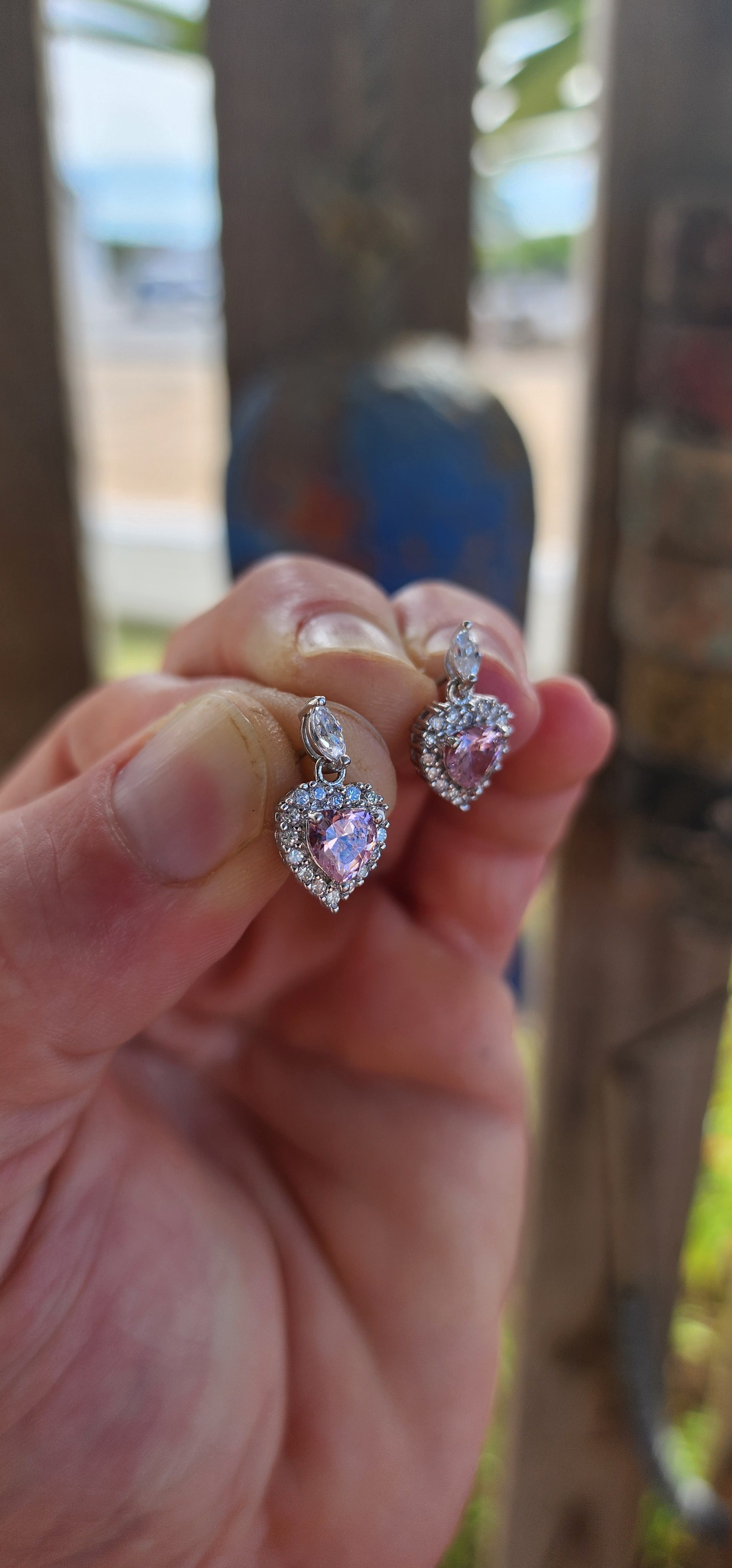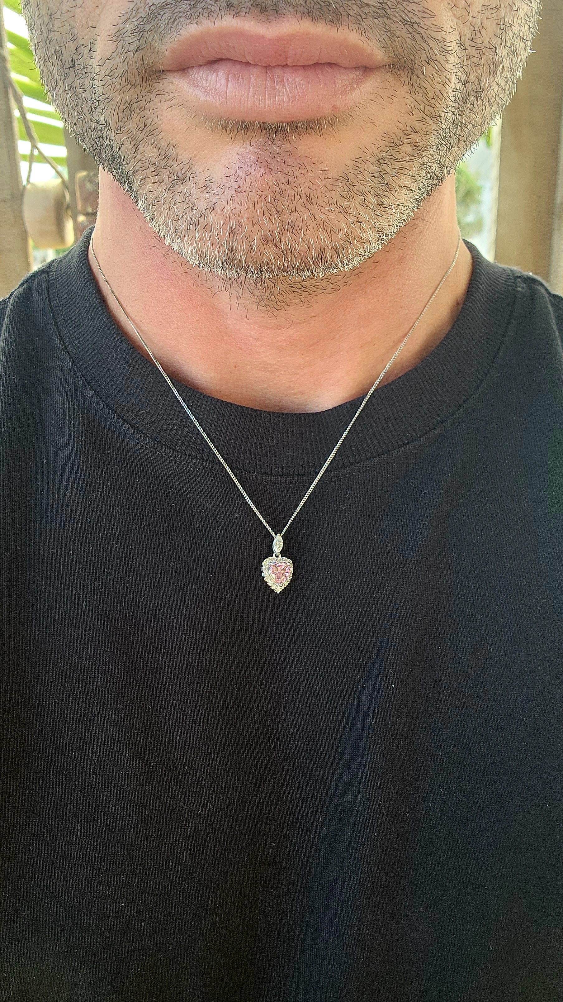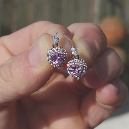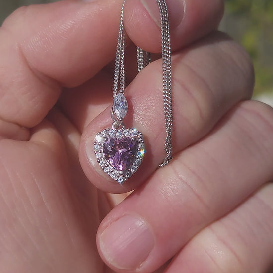 The pendant and earrings each showcase a beautifully faceted pink heart-cut cubic zirconia at the centre — soft, blushy, and full of light-catching fire.