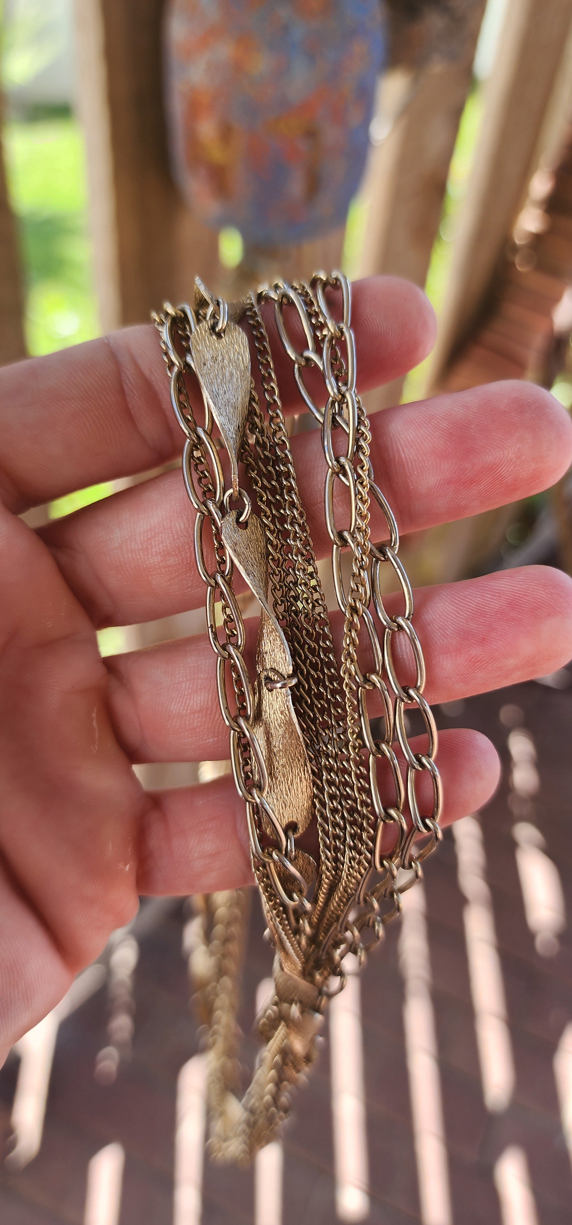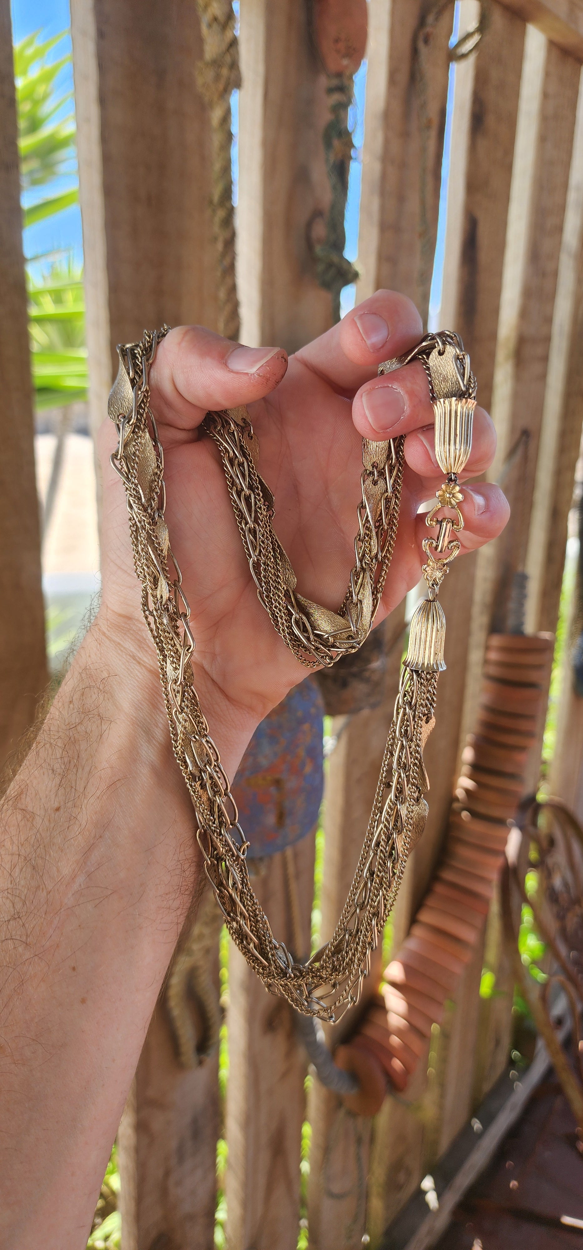 This vintage 1990s gold-plated multi-chain costume necklace is a stunning statement piece with an air of regal elegance and timeless charm. It features a richly layered cascade of varied chain styles, including delicate curb chains, bold open-link designs, and twisted panel elements, all interwoven to create a luxurious draped effect.