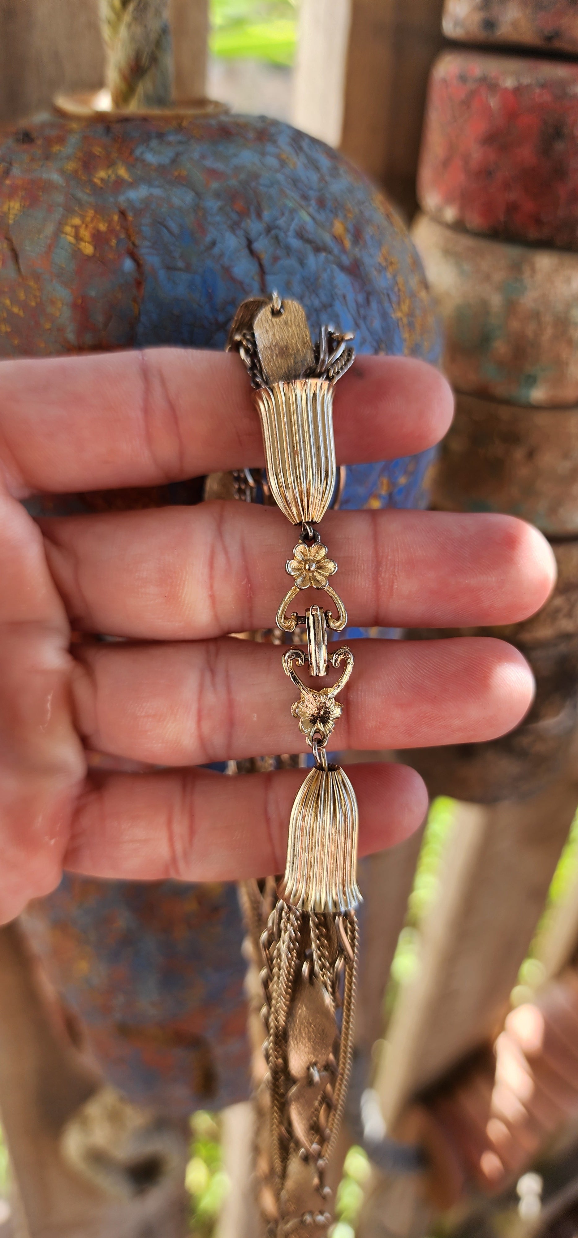 Though the gold plating shows some subtle signs of wear, it only adds to the vintage character of the piece, making it a well-loved treasure rather than a flaw. When worn, any wear is practically unnoticeable, allowing the rich golden tones and intricate detailing to take center stage.