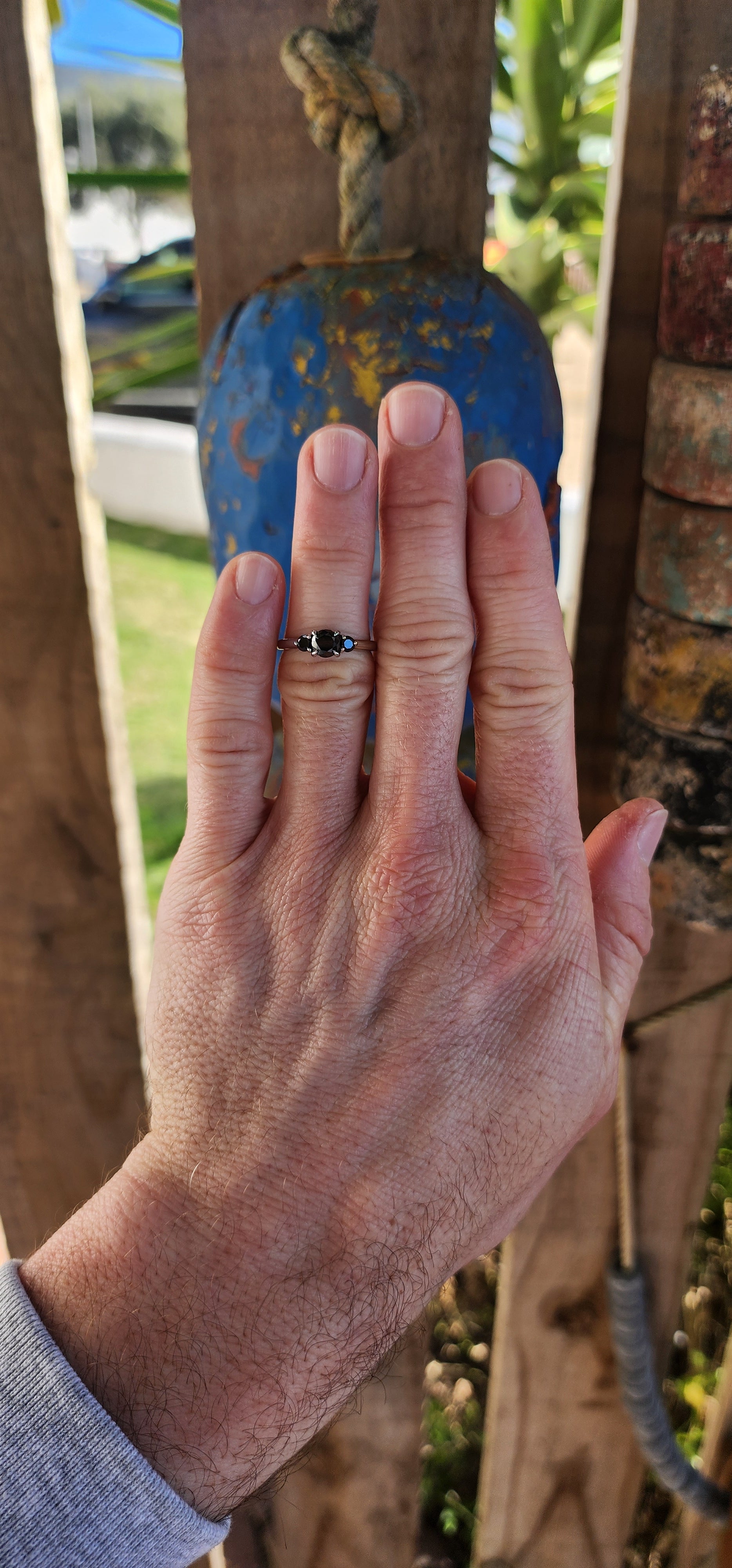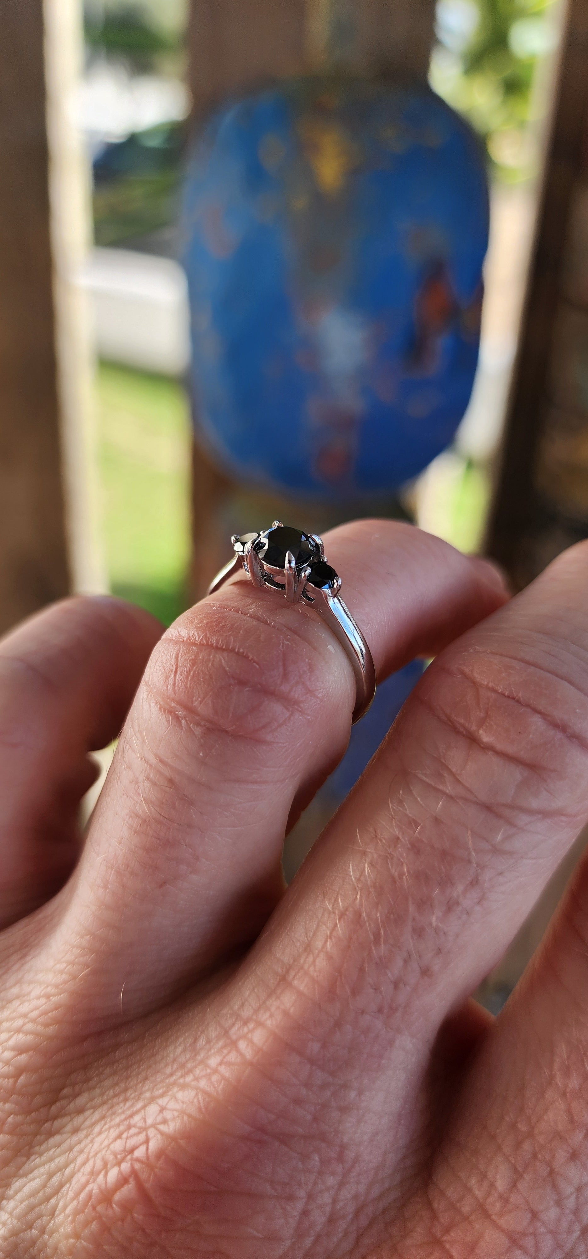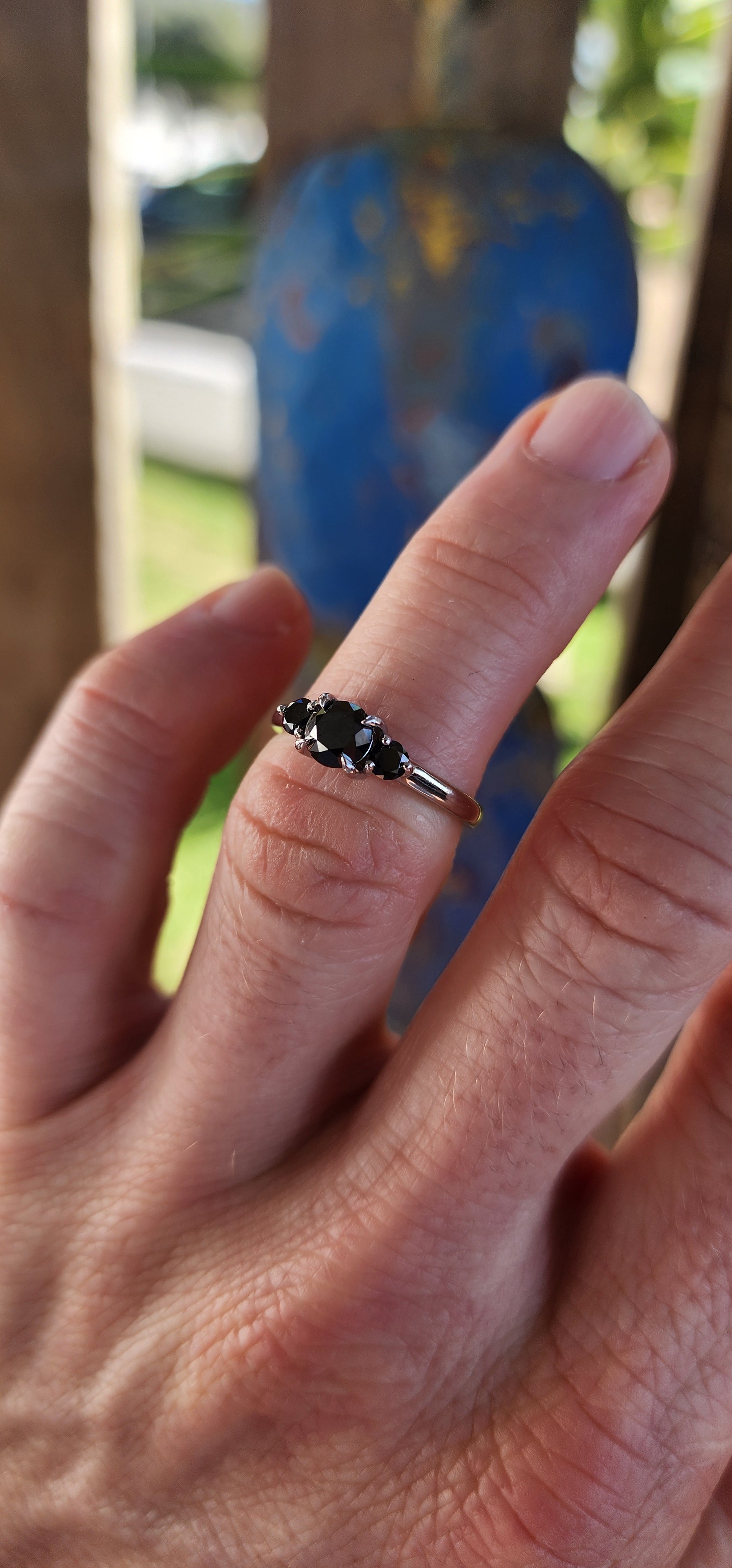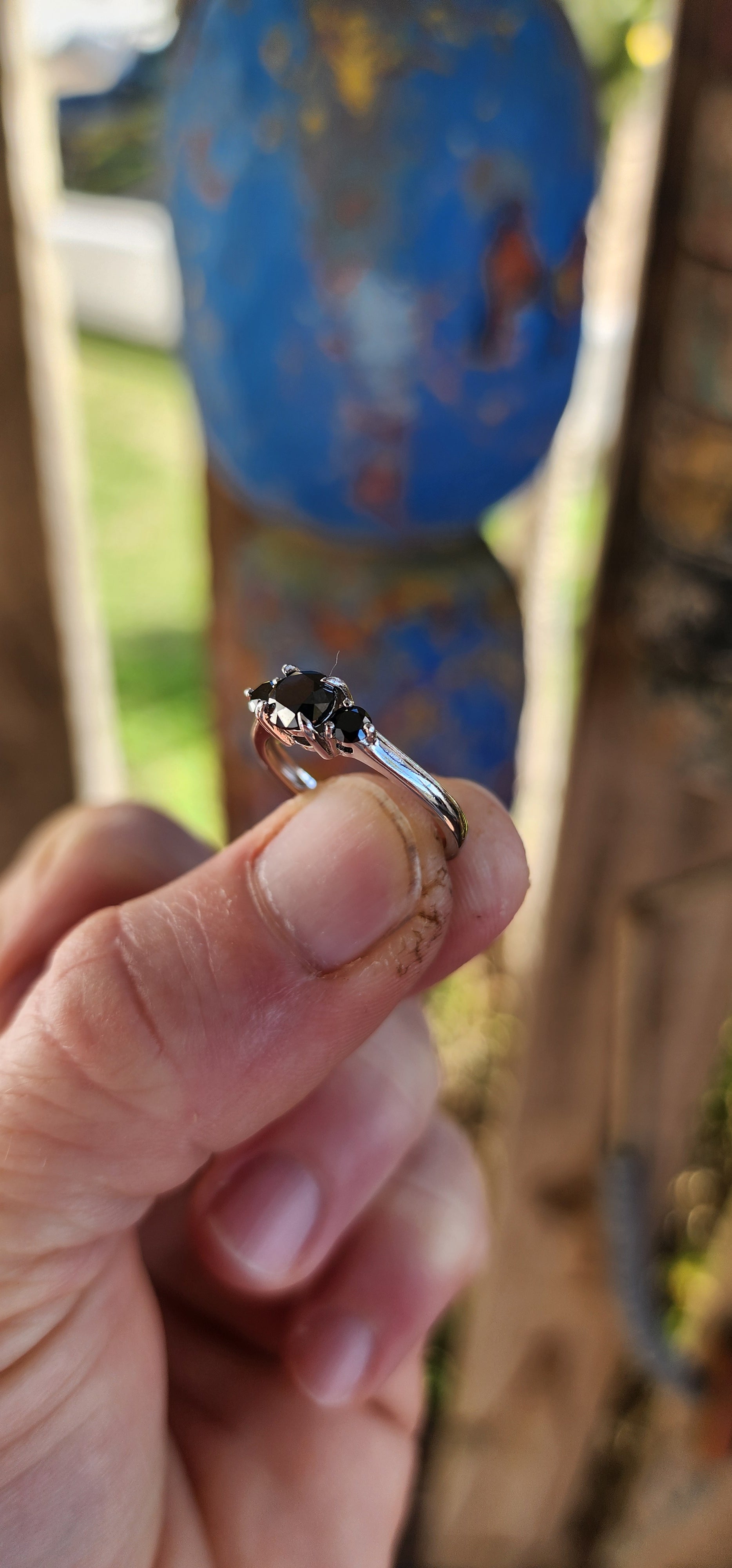 At its heart burns a trio of black diamonds, each one a shadowed star captured in crystalline form. The largest, seated proudly at the center, gleams like a midnight moon, while its two companions flank it like guardians of hidden realms.
