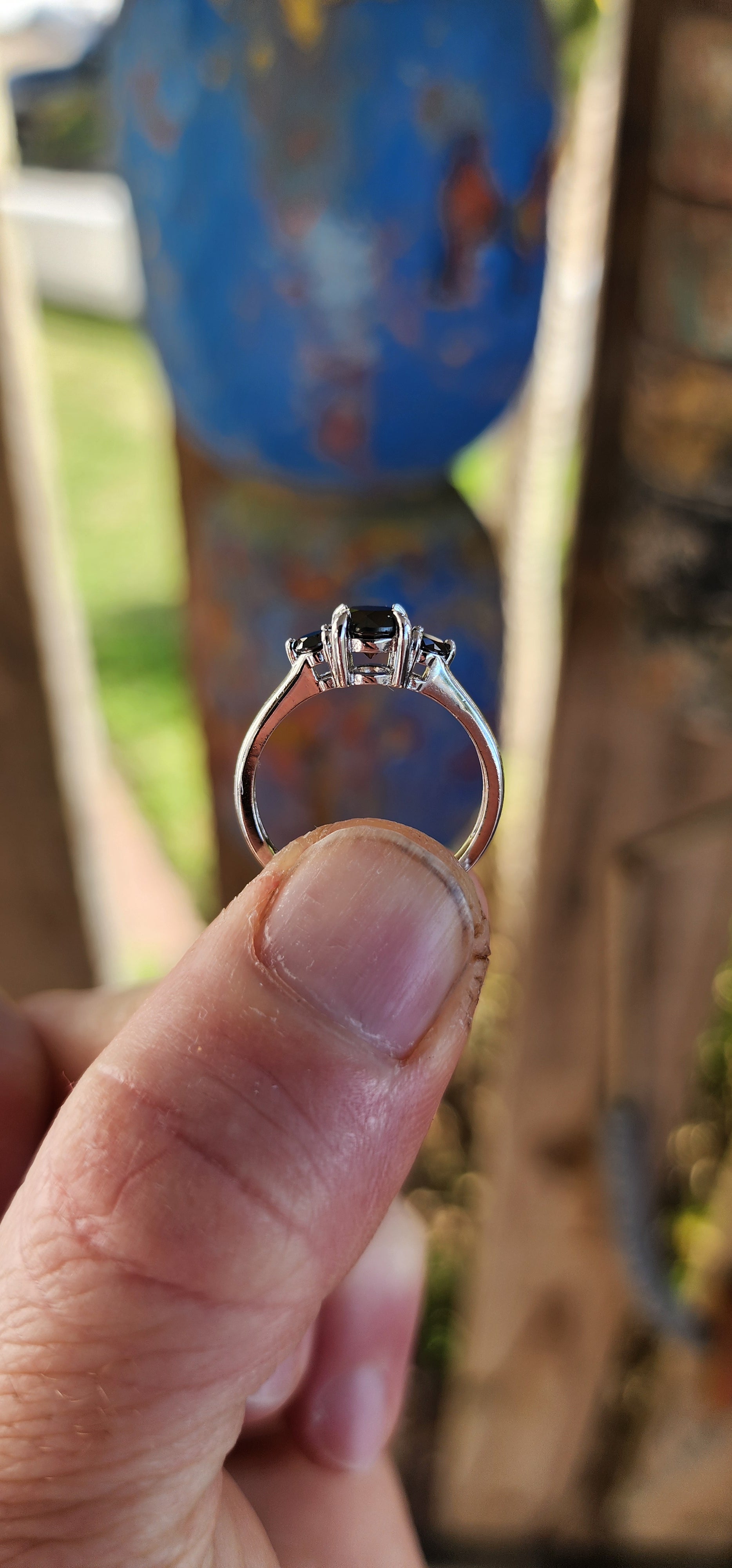Midnight Trinity A ring that whispers secrets of the night sky.Crafted in sterling silver and rhodium-plated to hold its forever-sparkle.