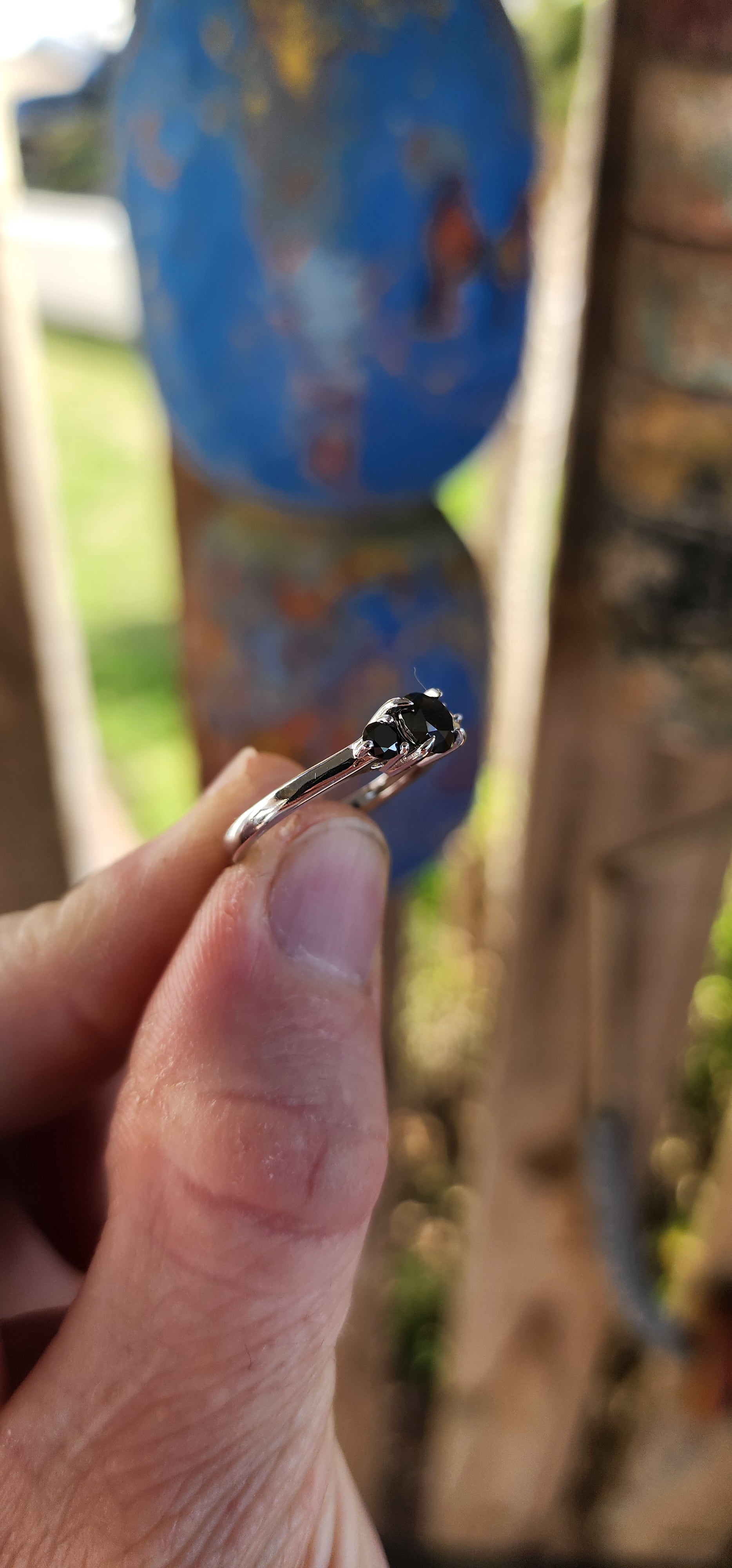 The diamonds, prong-set with delicate precision, glimmer with a dark, enigmatic fire—light dances across their faceted surfaces only to be swallowed back into their depths, as though they conceal ancient mysteries.