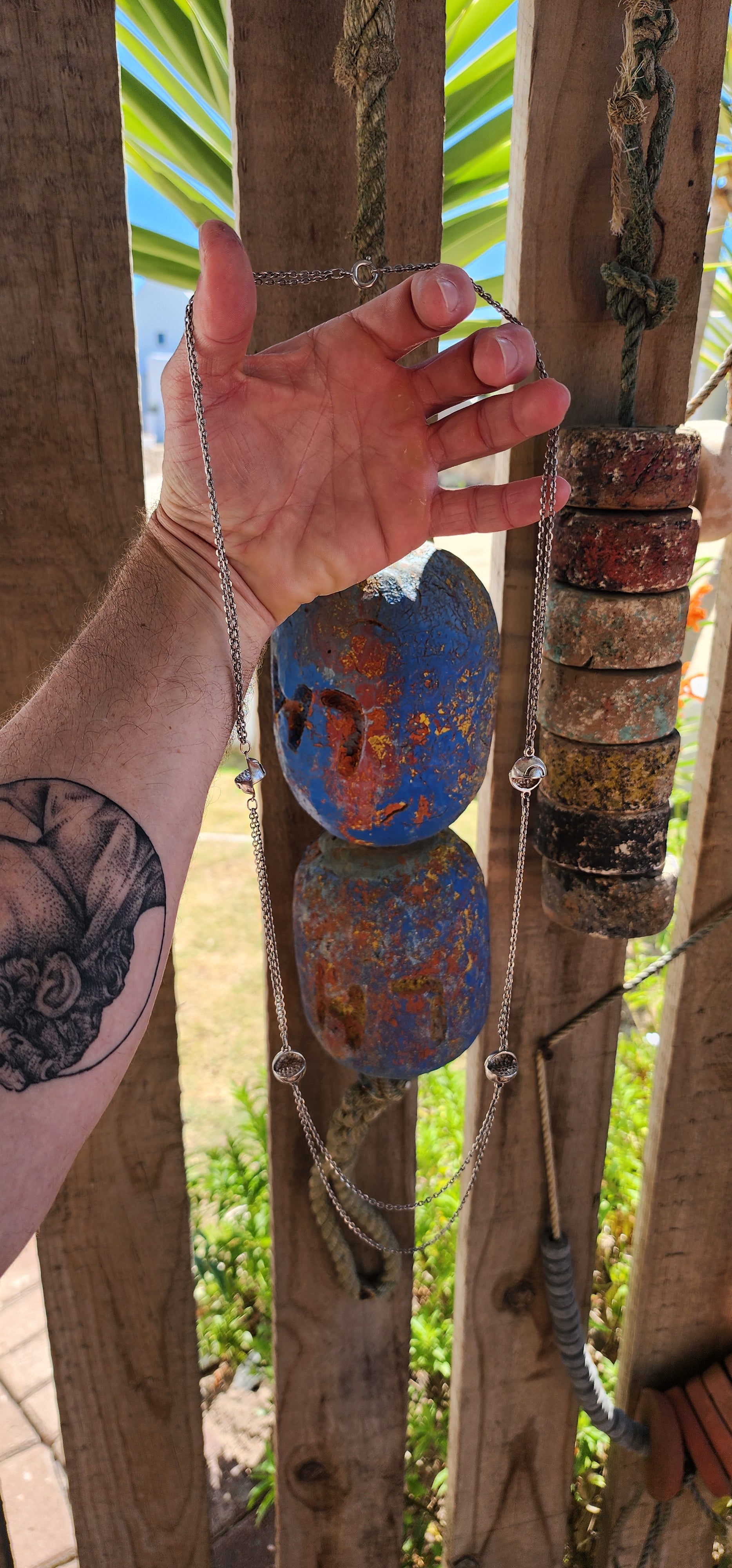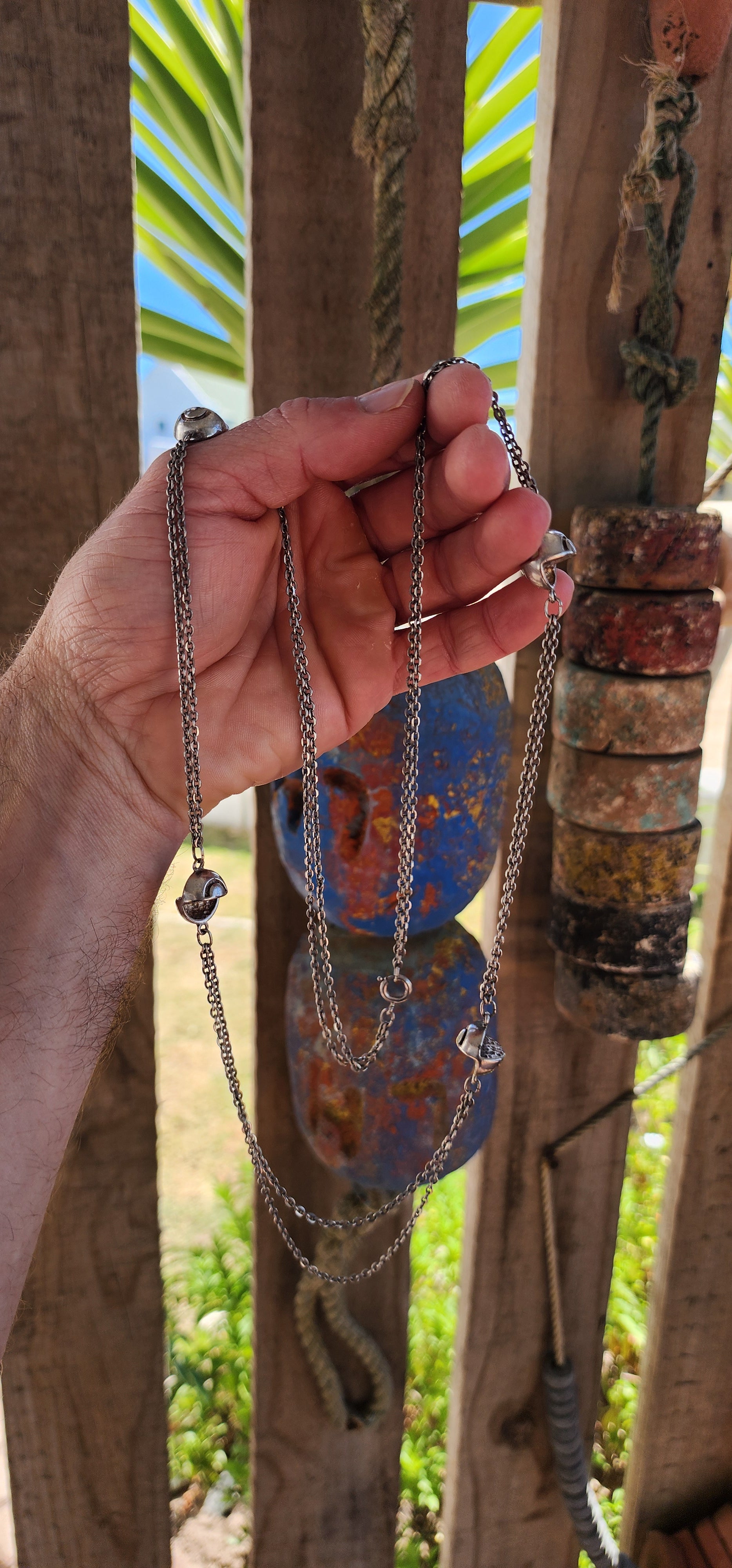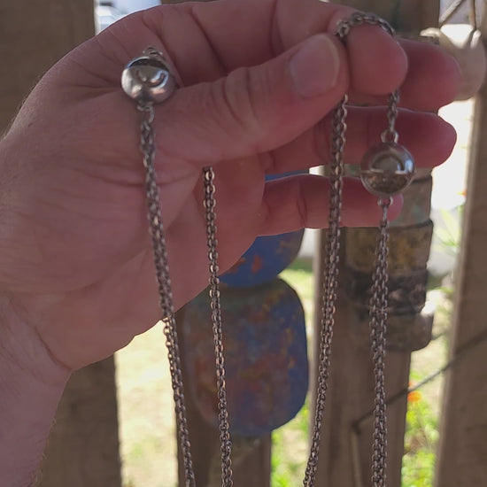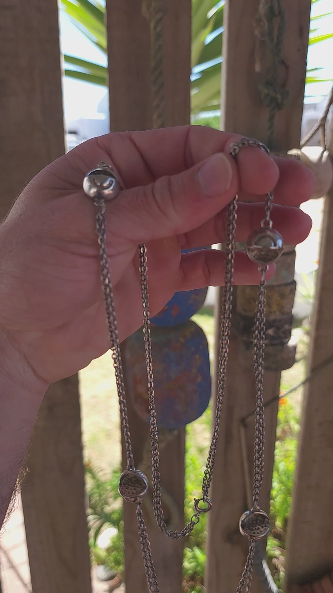 The necklace is crafted in solid sterling silver and features a beautifully fluid double-strand design made up of oval links. The real stars of the show, however, are the sculptural spherical elements placed along the length of the chain. These are no ordinary beads — each sphere is a miniature work of art.
