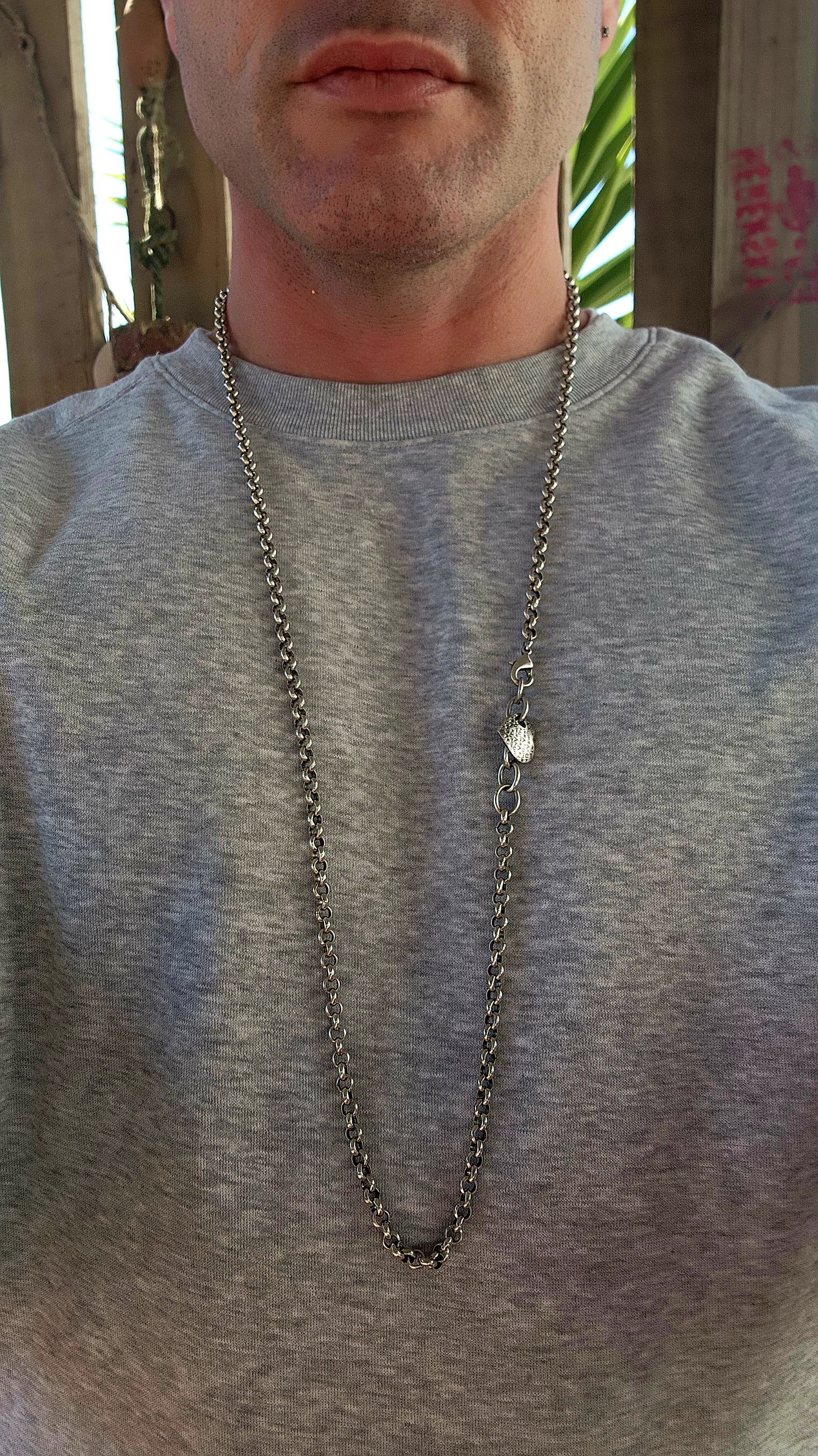Up for grabs is this extra-length silver-plated rolo link necklace, an early creation by the renowned local designer Armilla. Known for their bold, statement chain work and modern yet timeless designs, Armilla pieces were always crafted to balance everyday wearability with a touch of luxury.
