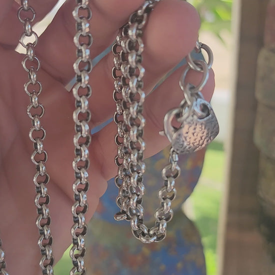 This particular necklace showcases heavy, rounded rolo links with a beautiful weight and drape, finished with a secure lobster clasp. A signature heart-shaped charm dangles near the clasp, textured and stamped with the repeating name “ARMILLA” — a mark of authenticity and one of the earliest designer motifs the house used.