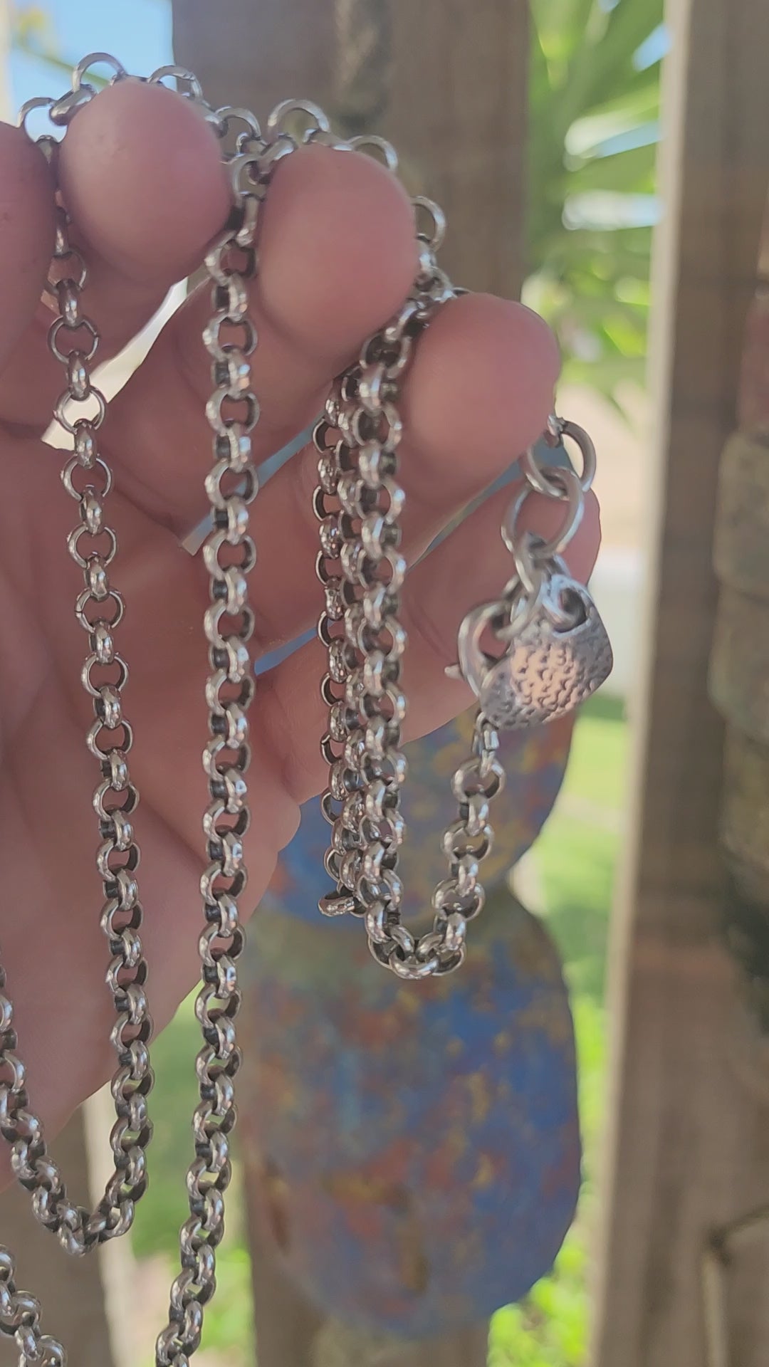 Measurements :The necklace with a length of 94cm.Each of the rolo links measure 5.70mm in diameter.The necklace with a weight of 51grams.