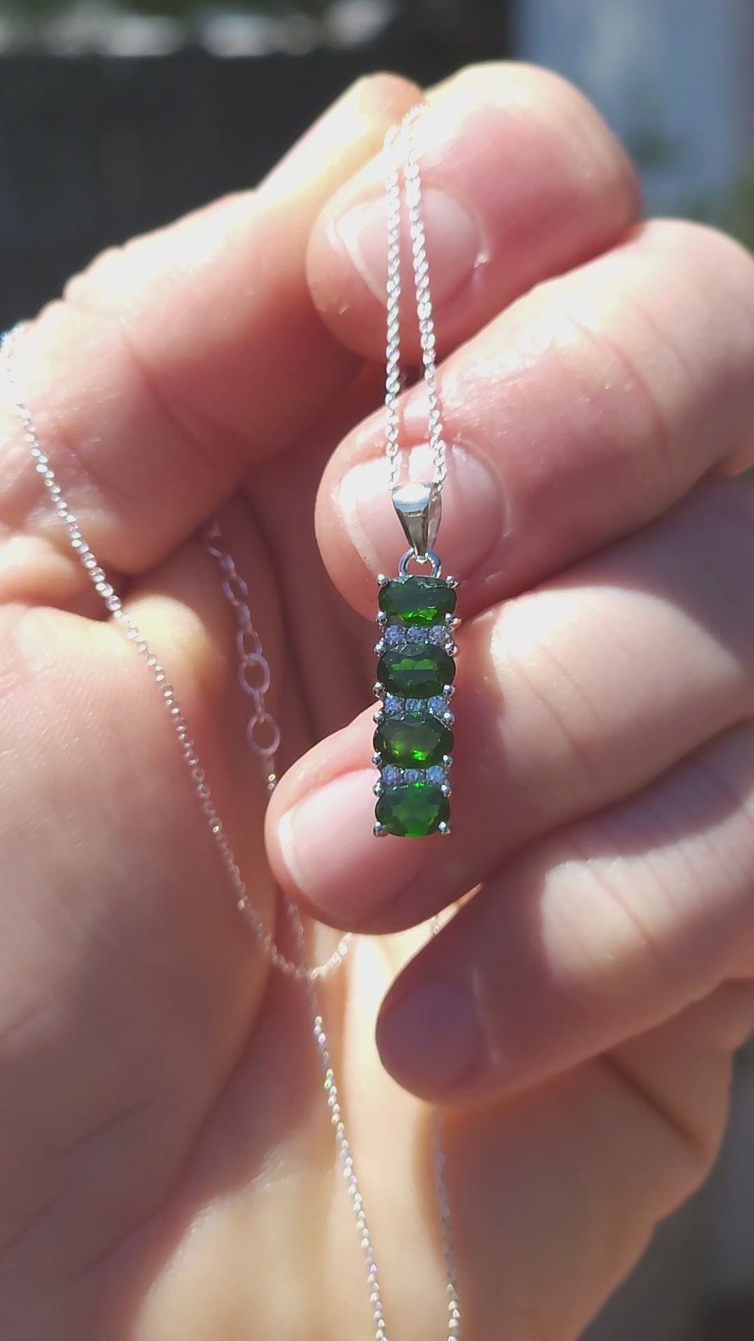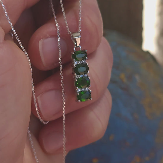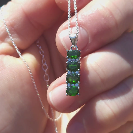 Each oval-cut Diopside is prong-set and interspersed with petite white CZ accents, giving the pendant lively sparkle and airy separation between the vivid greens.